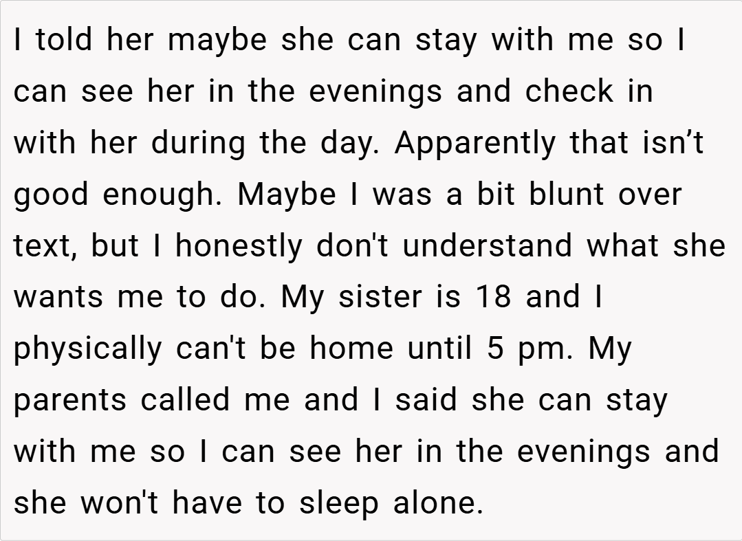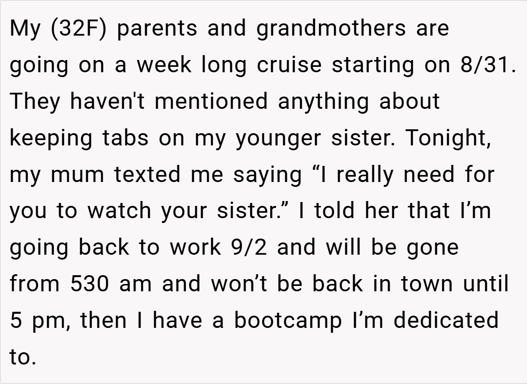 In this scenario, a 32-year-old woman is faced with an unreasonable request from her parents to babysit her 18-year-old sister while they embark on a week-long cruise. With a demanding work schedule—leaving home at 5 AM, being away until 5 PM, and committed to a bootcamp—the OP explained that her sister, who is legally an adult,