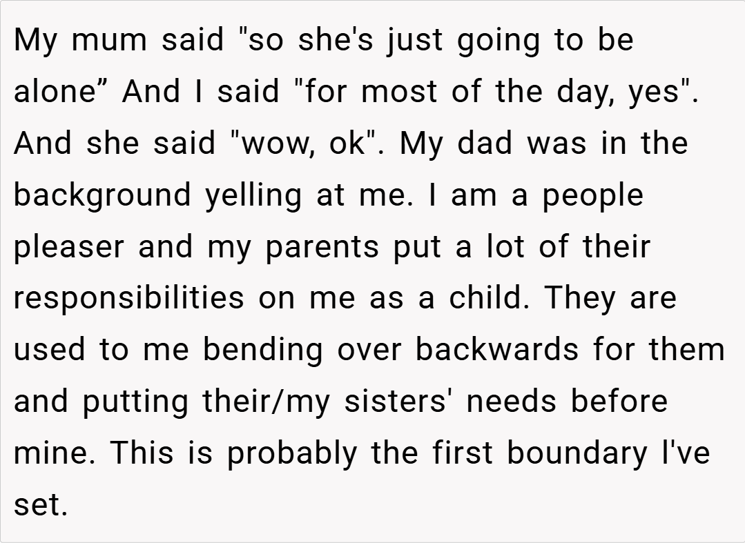 can be on her own for most of the day. Her parents, however, remain insistent that she find a way to supervise her, despite her offering a reasonable compromise: having her sister stay with her in the evenings for companionship. Feeling pressured and setting the boundary for the first time, she snapped at them, which only escalated the tension.