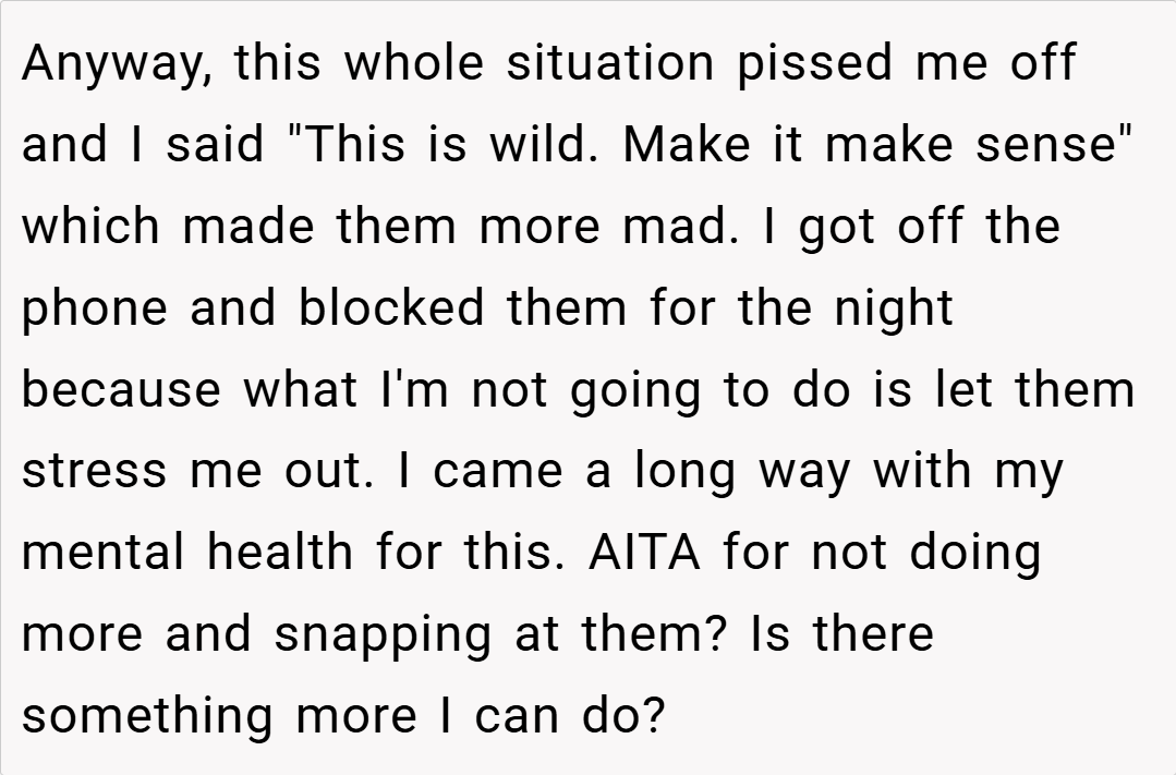 Family therapists emphasize the importance of setting healthy boundaries, especially when adult responsibilities begin to interfere with personal well-being. Dr. Laura Markham, a specialist in family dynamics, notes, “It’s essential for individuals to establish clear boundaries with family members. When parents impose unreasonable demands—such as requiring babysitting for an adult—it can lead to resentment and burnout.” (https://www.ahaparenting.com) In this case,