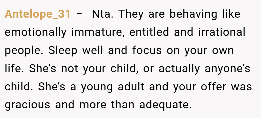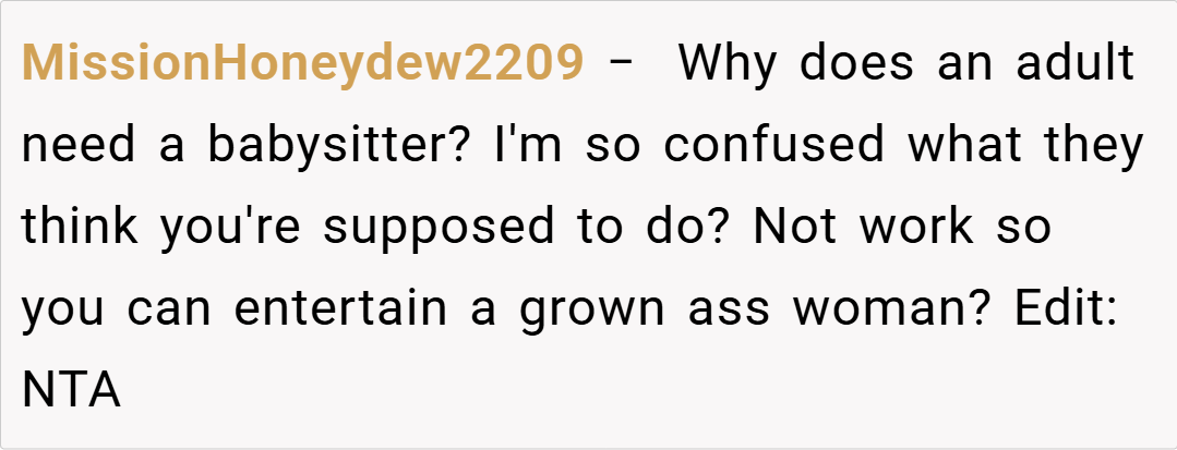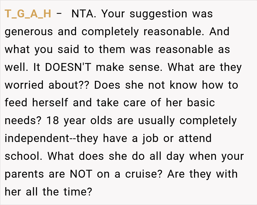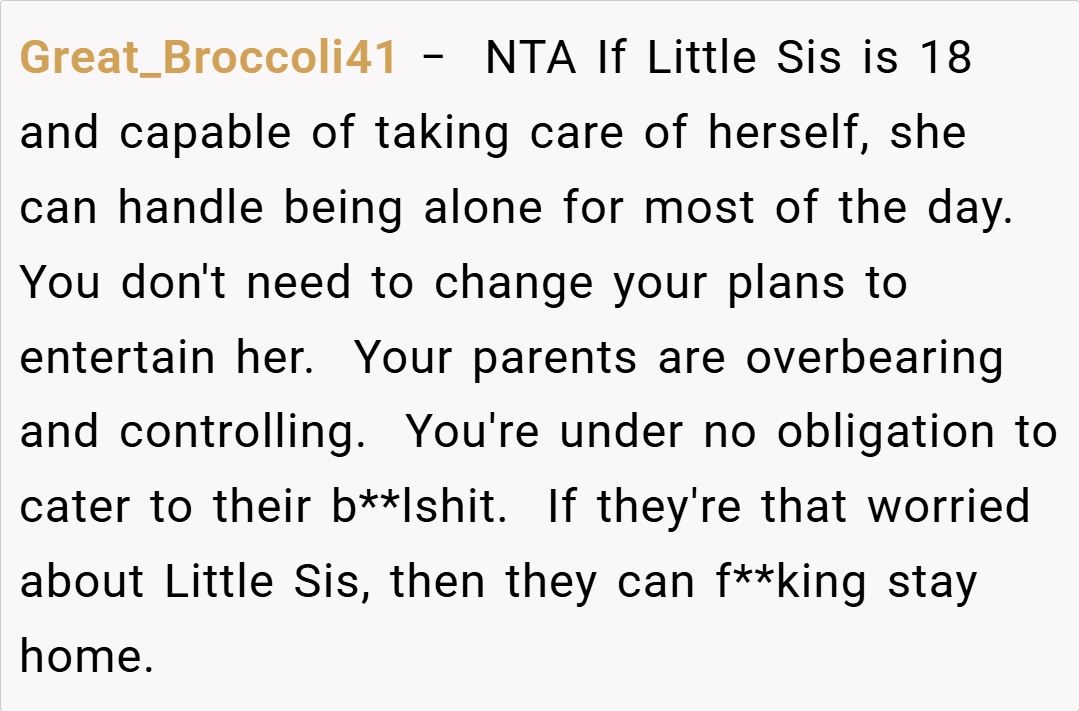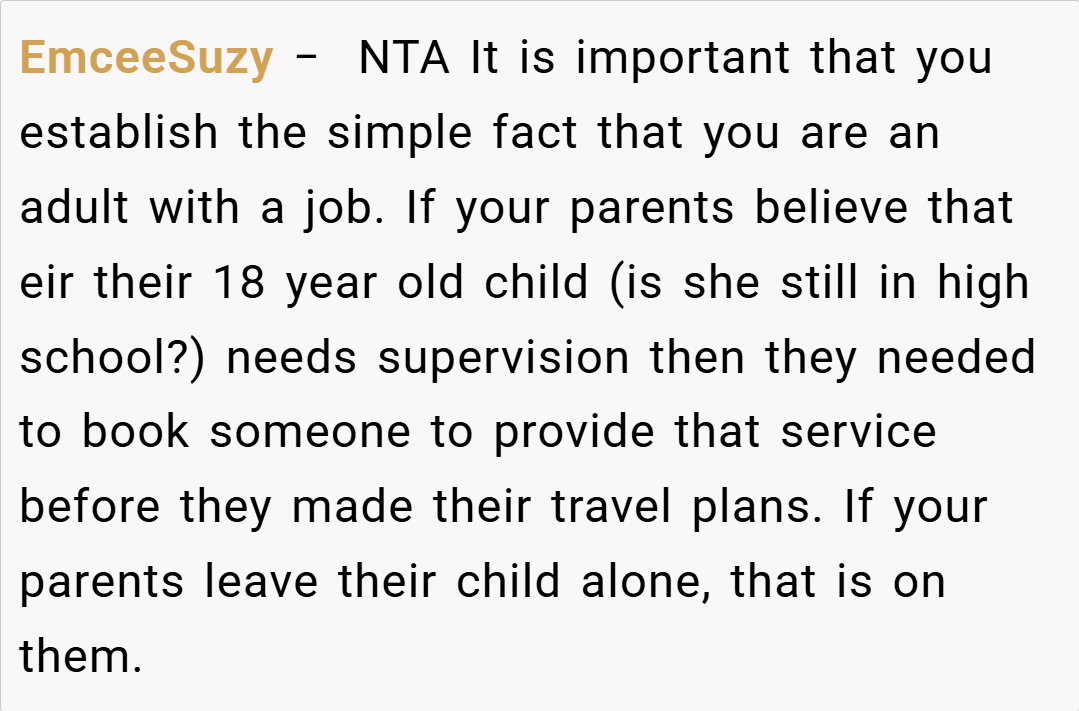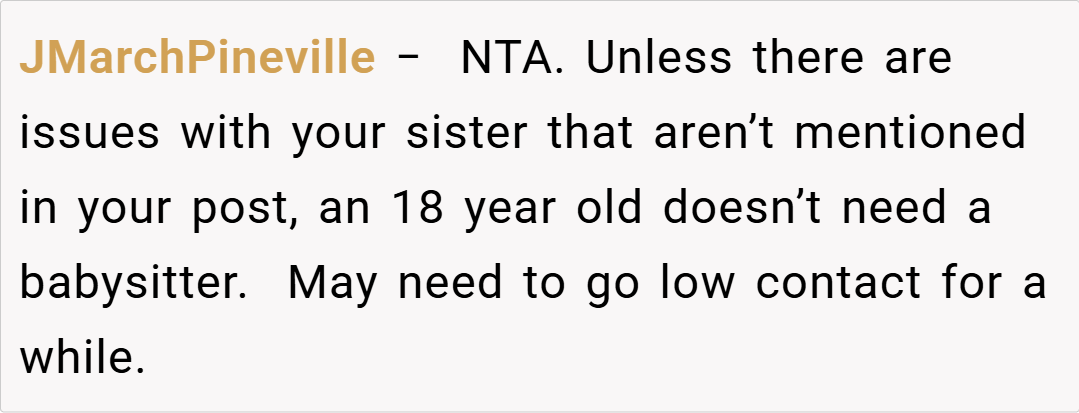 The Reddit community is overwhelmingly in support of the OP. Many commenters agree that it’s absurd to expect someone to babysit an 18-year-old, particularly when that person has significant work and personal obligations.