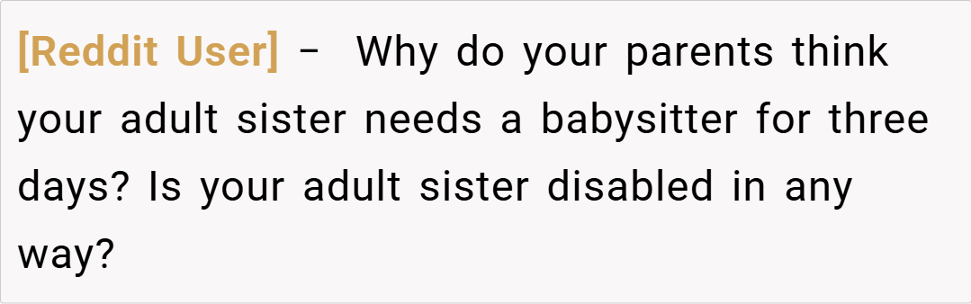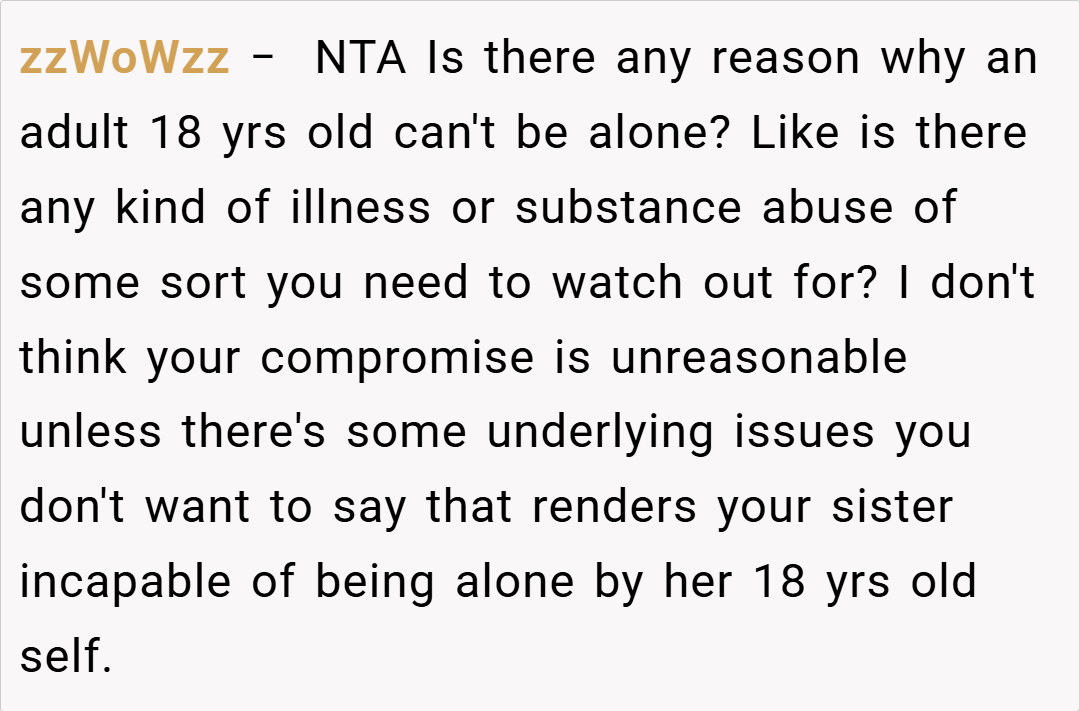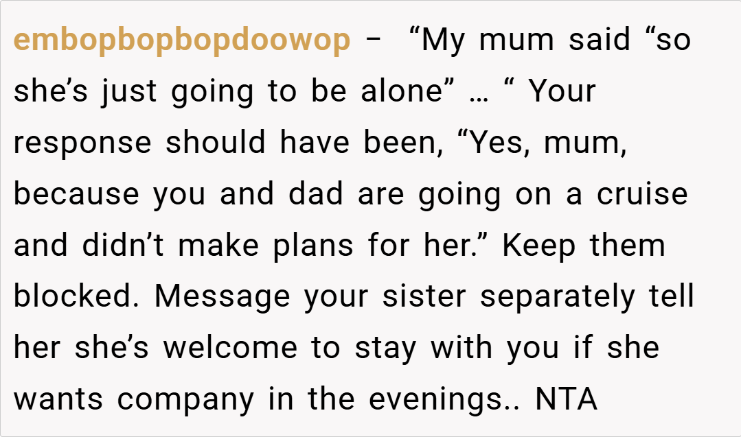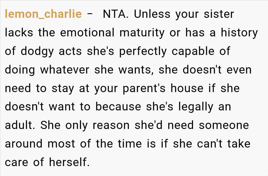Commenters have pointed out that the parents are acting immaturely by not planning adequate care for their adult child. They consistently reinforce that the OP is under no obligation to rearrange her life to accommodate an unreasonable request, and that the responsibility for ensuring her sister’s safety lies squarely with the parents.