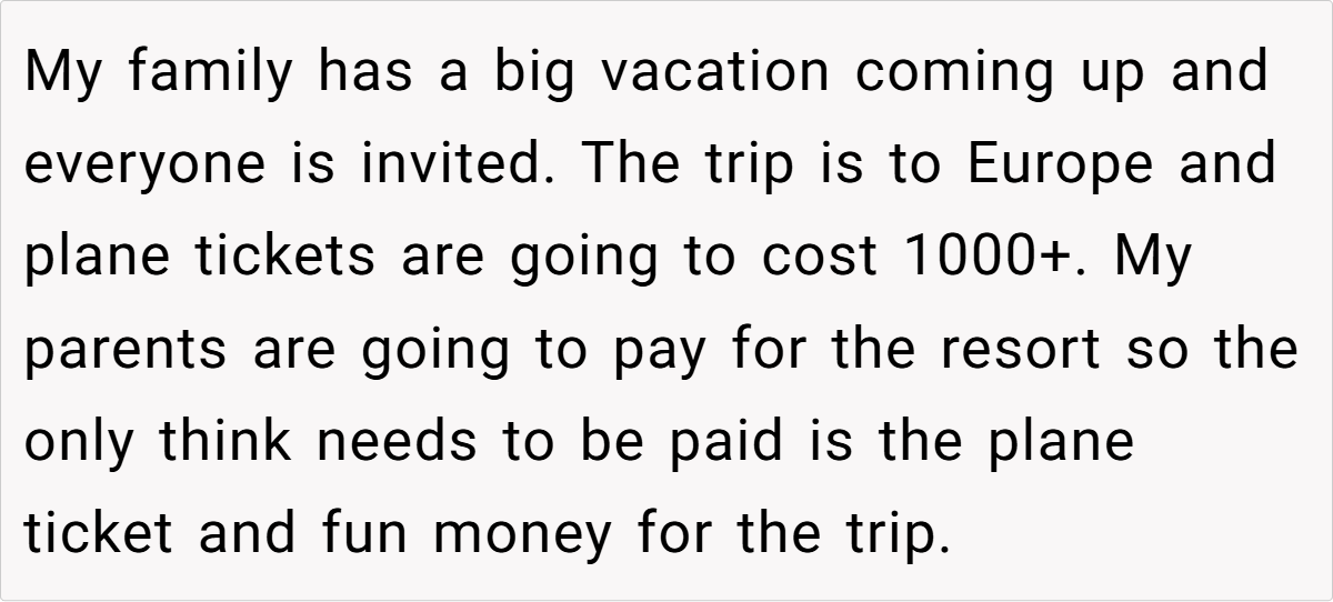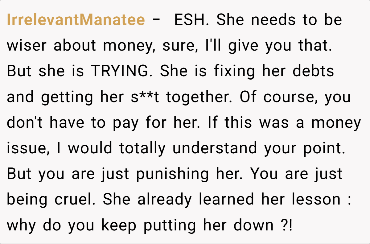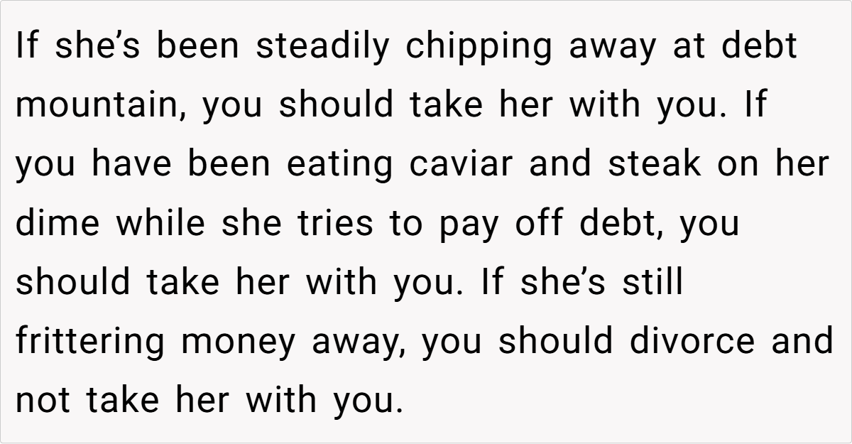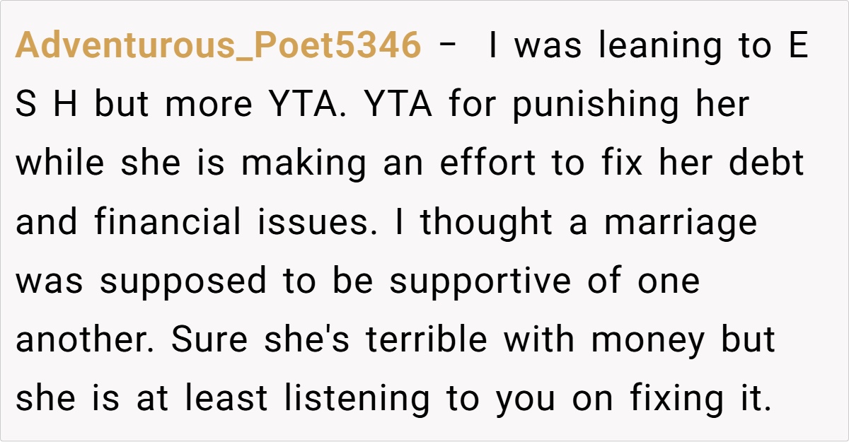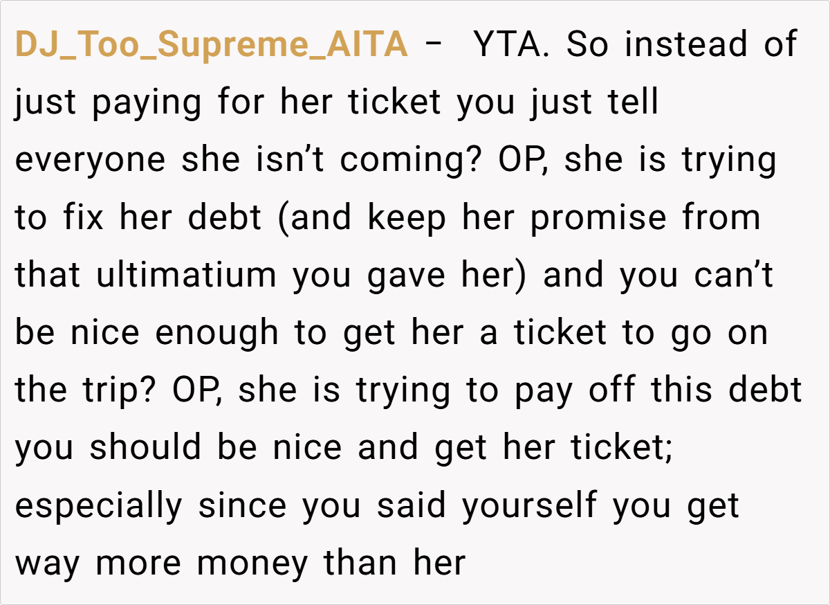 Across Reddit, the overall consensus is that the husband’s decision to exclude his wife from the vacation feels overly punitive. Most redditors sympathize with the challenges of managing debt but criticize the approach of using a family event as leverage. The community feels that while financial accountability is important, relationships thrive on support and shared experiences—especially in times of hardship. Ultimately, many voices urge a more compassionate and cooperative solution rather than turning personal struggles into public punishments.