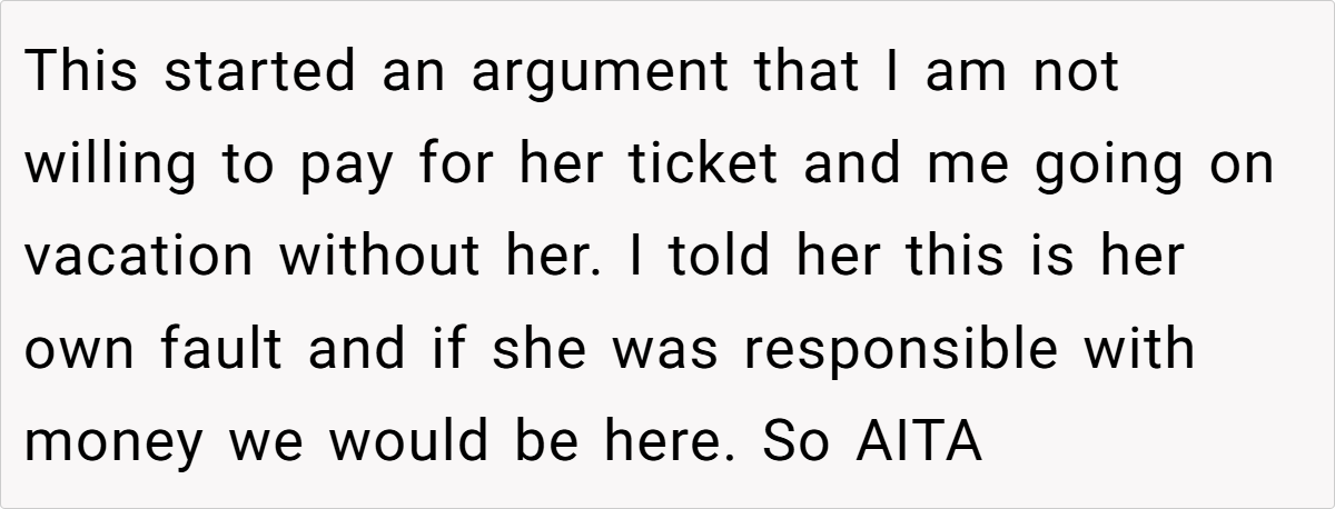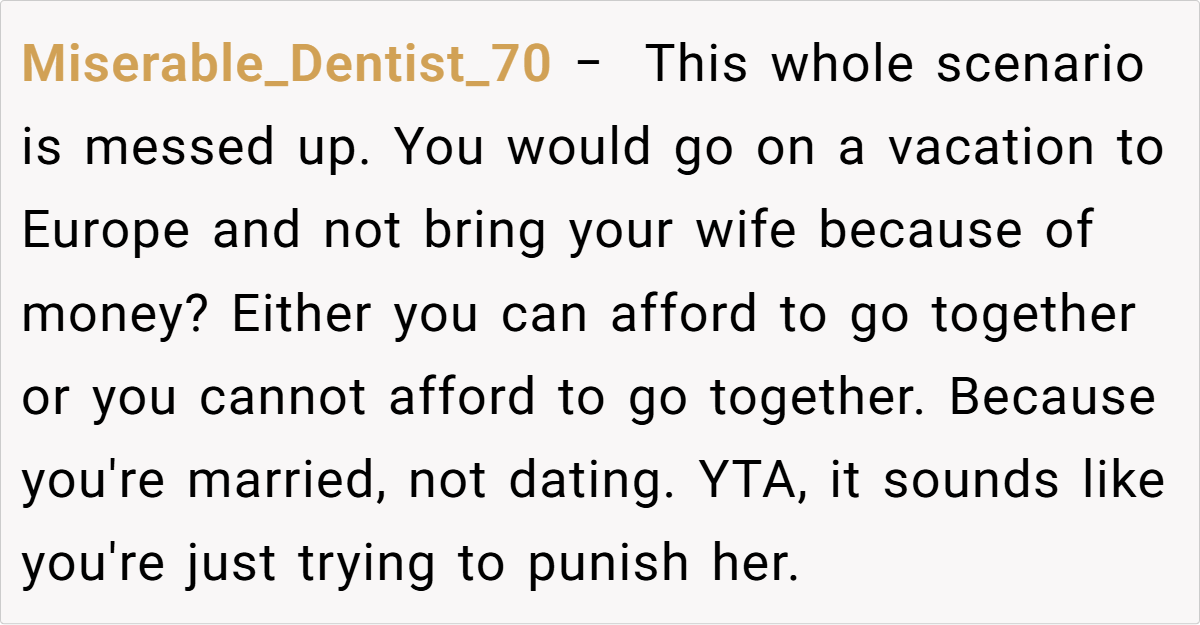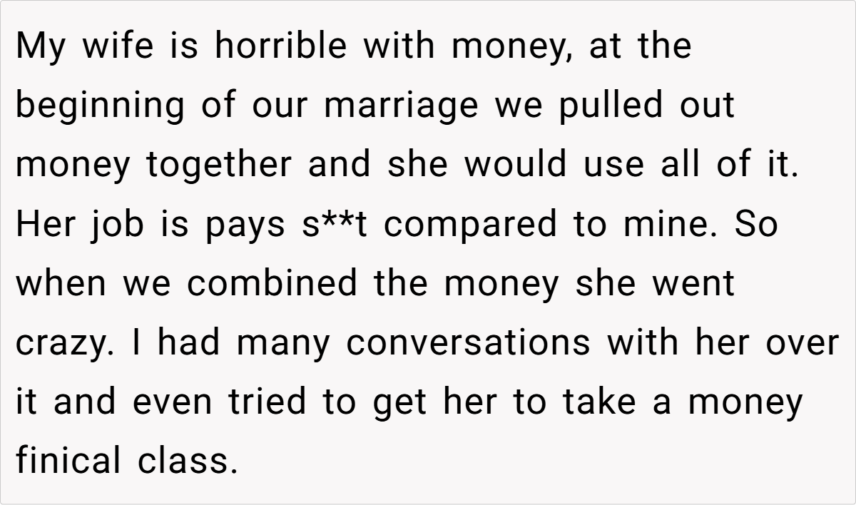 Letting finances dictate the tone of a relationship is never simple. When couples merge money without clear boundaries, even small differences in spending habits can lead to major conflicts. In this case, the husband’s frustration reflects a broader issue: a lack of shared financial goals. The clash isn’t just about a vacation ticket—it’s about trust, responsibility, and how financial mismanagement can erode the foundation of a relationship.