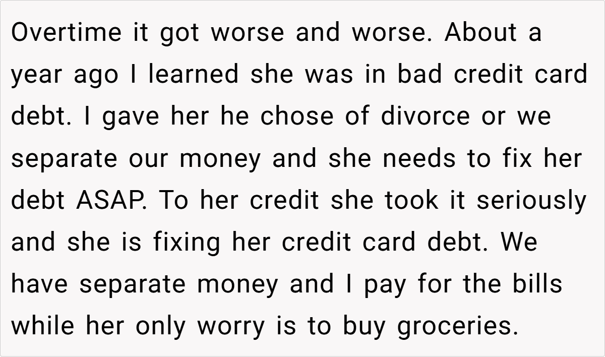 The situation clearly illustrates how personal money management and relationship dynamics are deeply intertwined. On one hand, the wife’s past habits of depleting shared funds have led to serious consequences, including accumulating credit card debt. On the other hand, the husband’s decision to segregate finances and impose ultimatums appears to be his way of reining in those habits. This tug-of-war between fiscal responsibility and marital support is a recurring theme in many households, making it a subject ripe for expert analysis.
