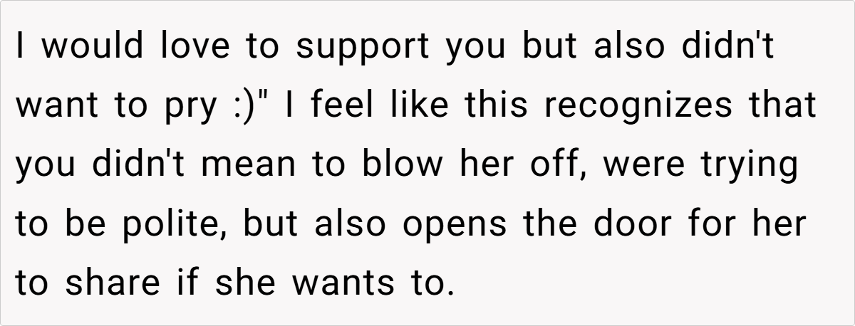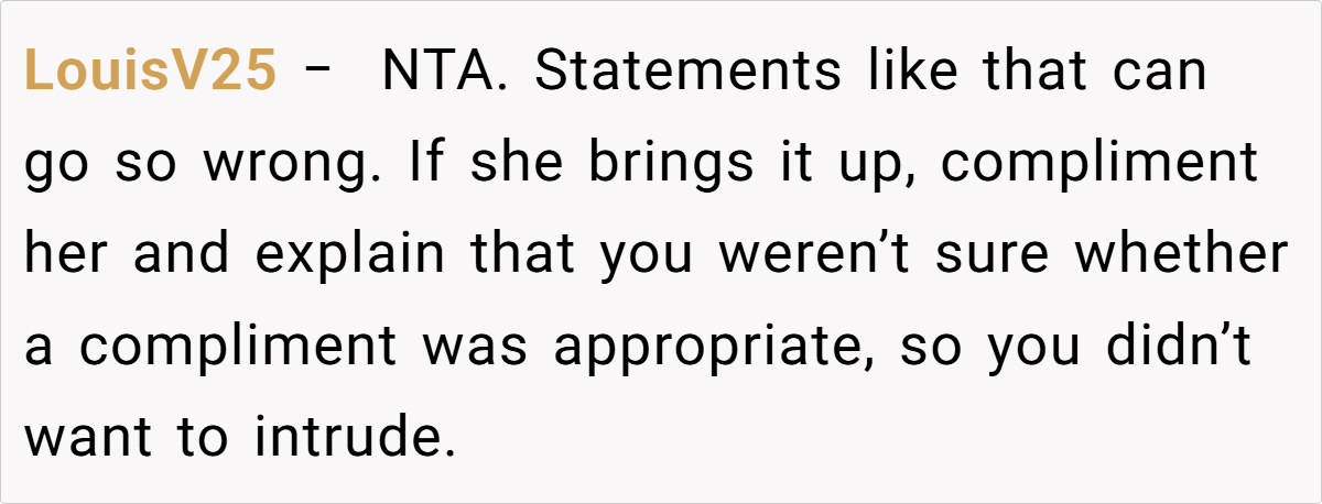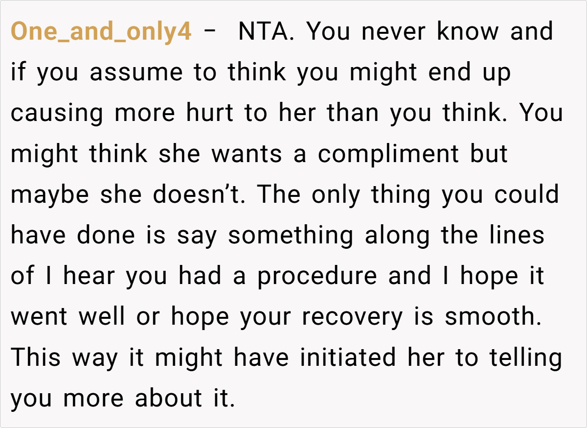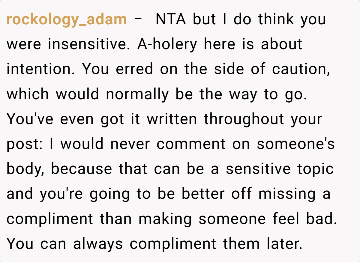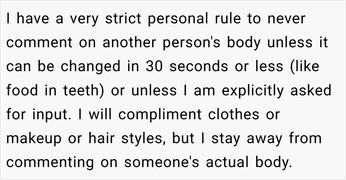 Was it reasonable for the user to stick to her personal rule about not commenting on someone’s body unless invited? Or should she have given a compliment in this case? How would you handle such a sensitive situation? Share your thoughts below!