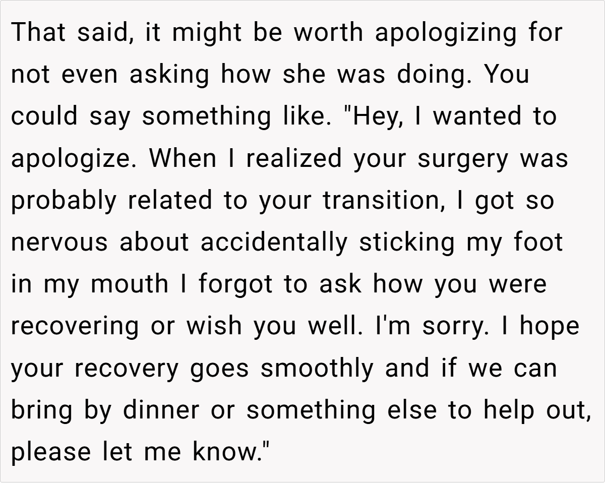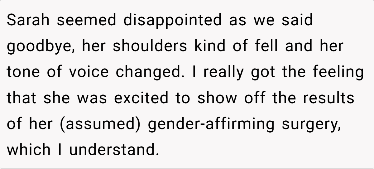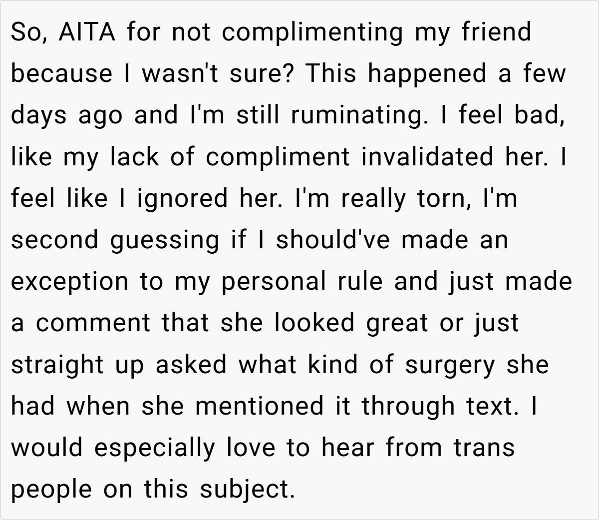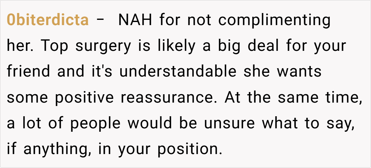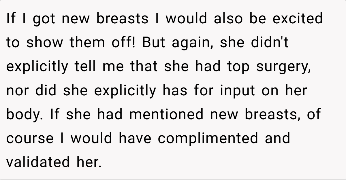 A Reddit user shares an experience where she felt unsure about whether or not to compliment her friend, Sarah, who is a trans woman. During a recent visit to Sarah’s home, the user noticed what seemed to be the results of Sarah’s top surgery but held back on commenting since Sarah didn’t explicitly mention it. Now, she wonders if her silence came off as dismissive and if she should’ve acknowledged the change. Read her story below to see how she navigated this delicate situation.