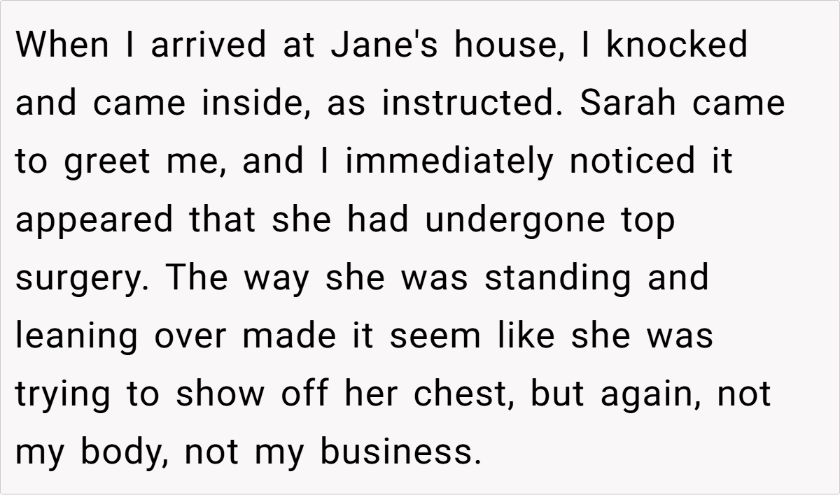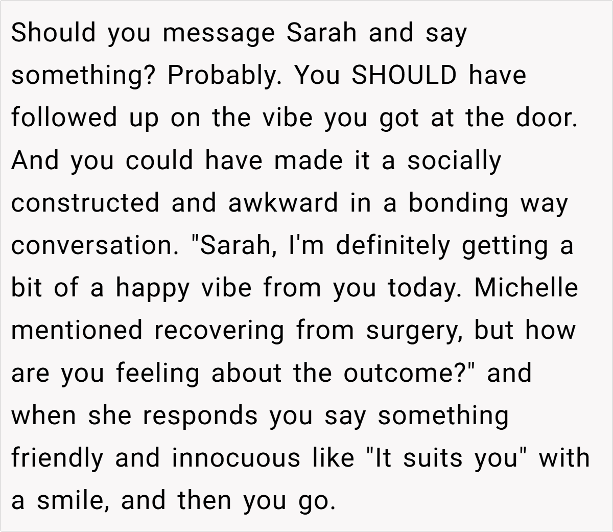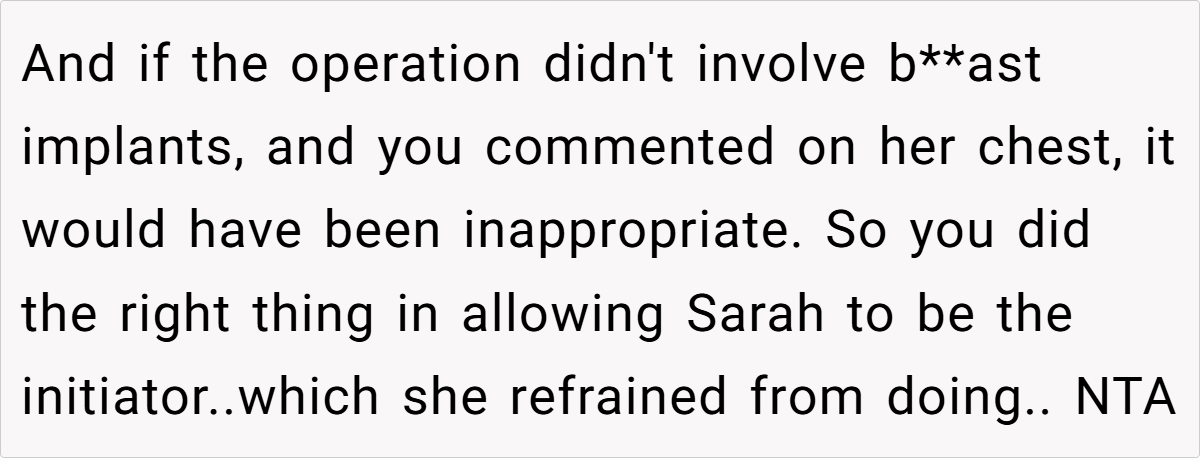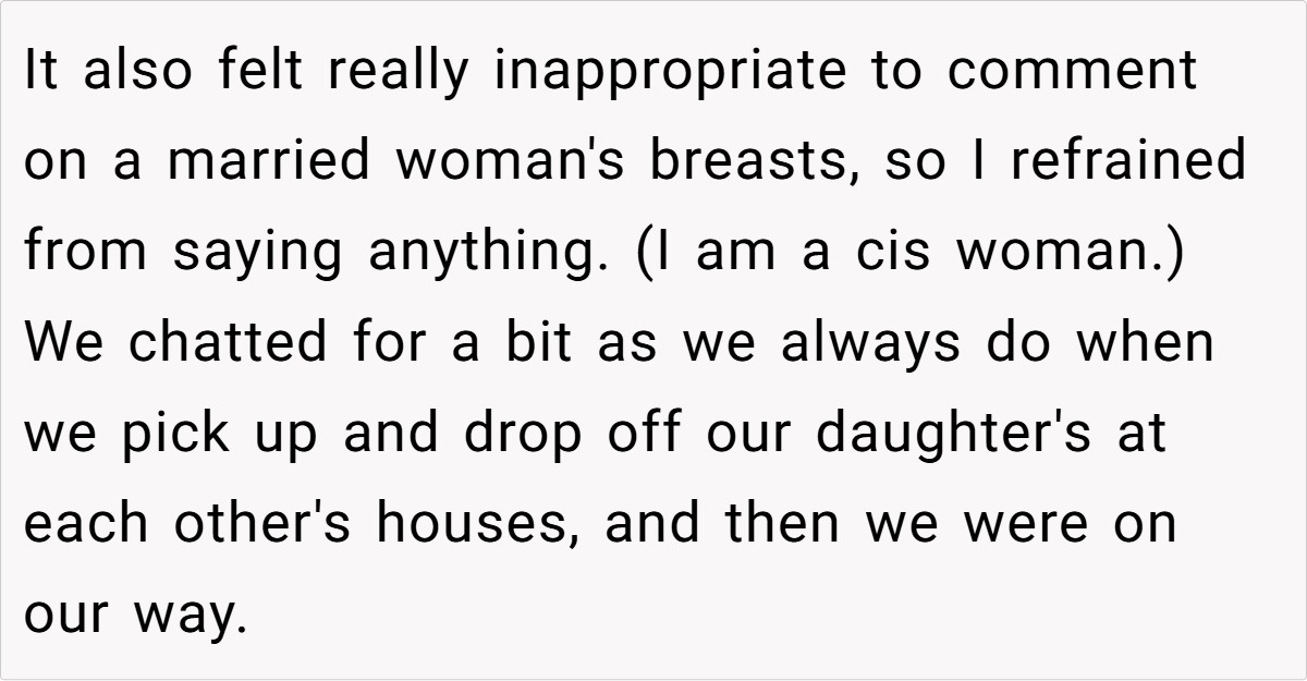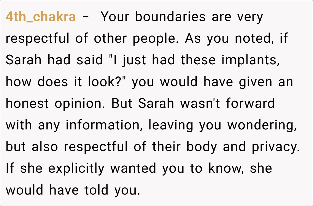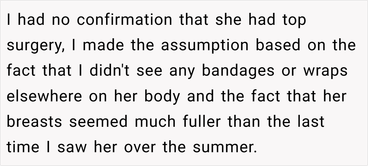 A Reddit user shares an experience where she felt unsure about whether or not to compliment her friend, Sarah, who is a trans woman. During a recent visit to Sarah’s home, the user noticed what seemed to be the results of Sarah’s top surgery but held back on commenting since Sarah didn’t explicitly mention it. Now, she wonders if her silence came off as dismissive and if she should’ve acknowledged the change. Read her story below to see how she navigated this delicate situation.