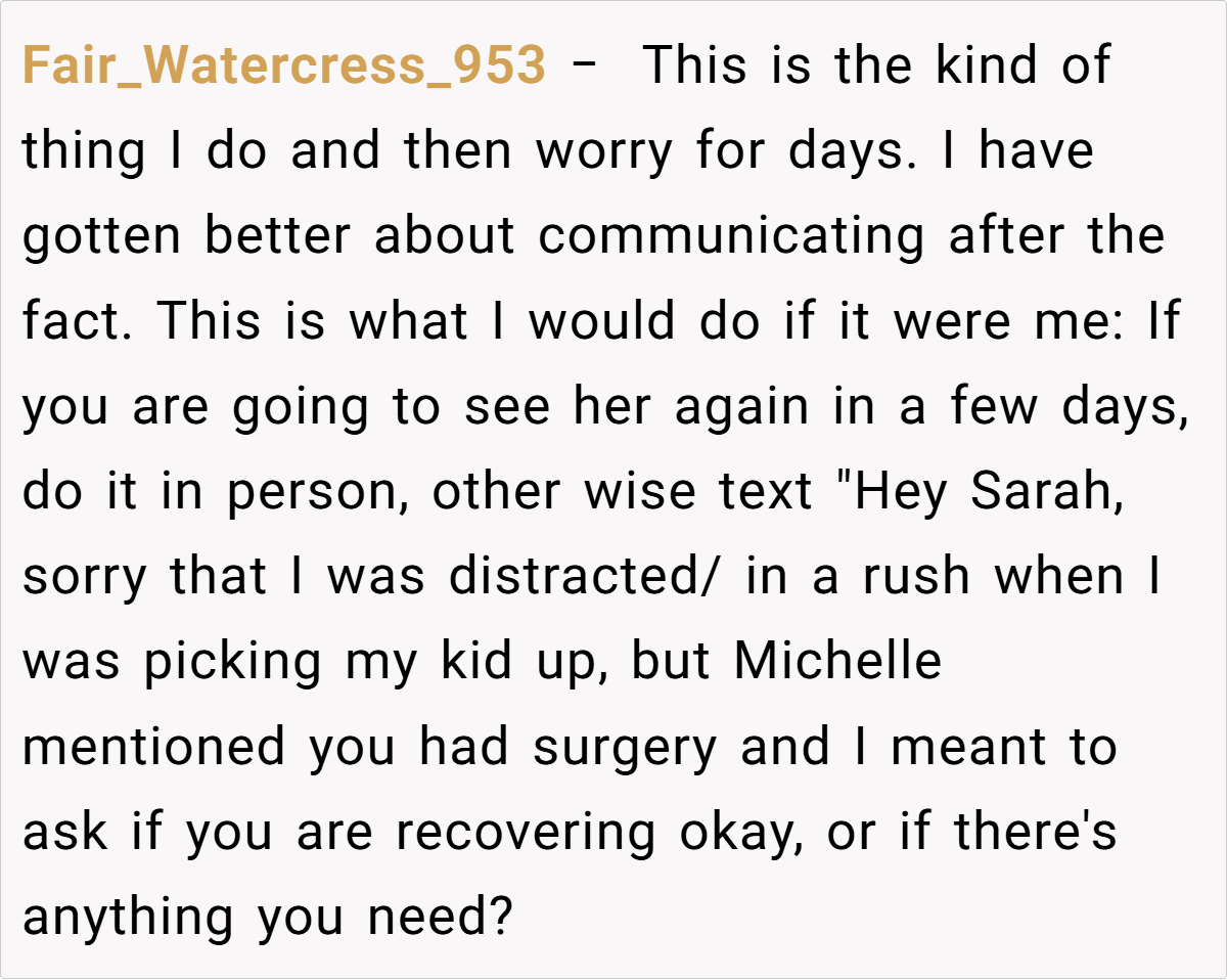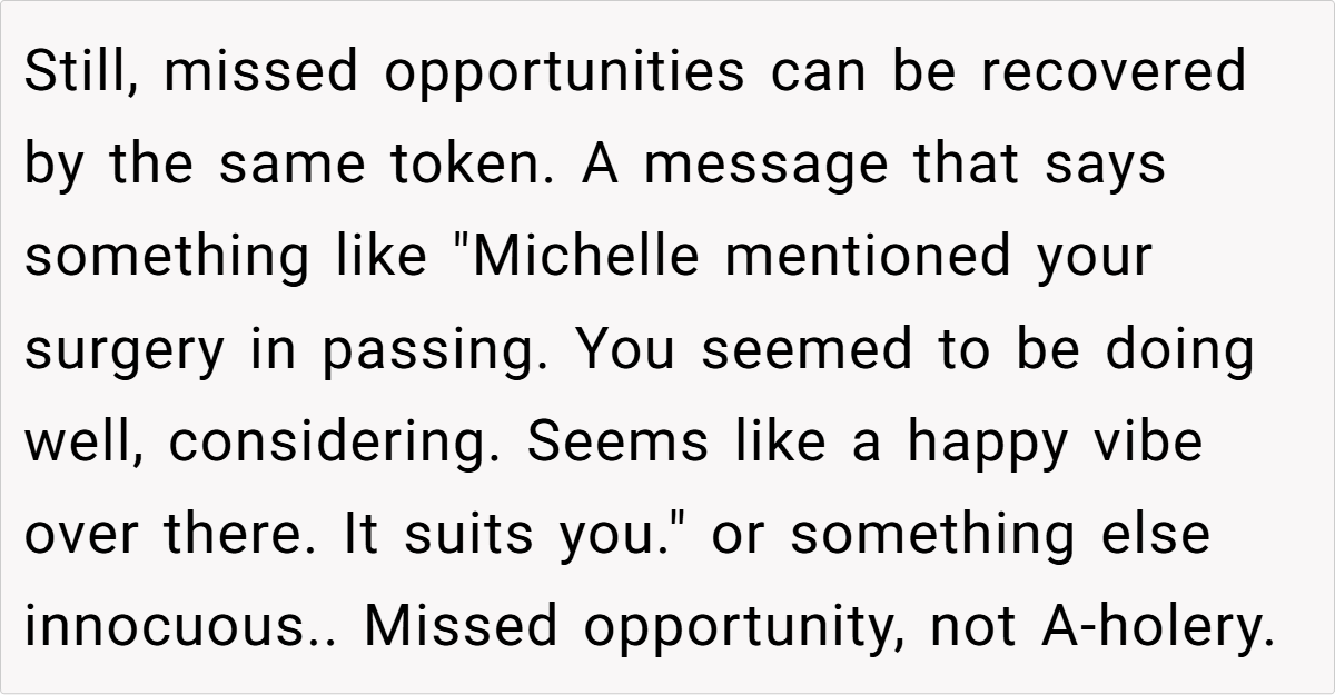 NTA, it’s like someone who may be on the bigger side, and you congratulating them on their pregnancy…. just don’t do it… you can always save face and text her, I am so sorry, mind was else where Michelle mentioned you had surgery, how are you feeling. Opening up conversation and if she chooses to explain further then go from there!
