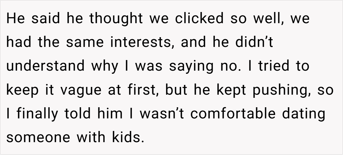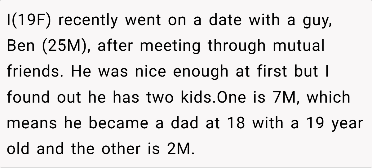 Dating is hard enough without being pressured into a situation you never wanted in the first place. That’s exactly what happened to OP (19F), who went on one date with Ben (25M) only to find out he had two kids. She knew from the start that dating someone with children wasn’t for her, so she politely declined a second date.