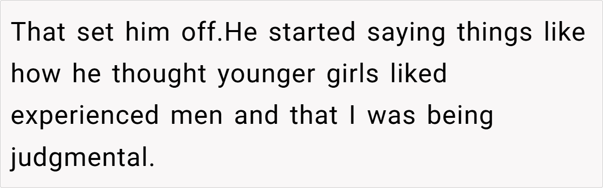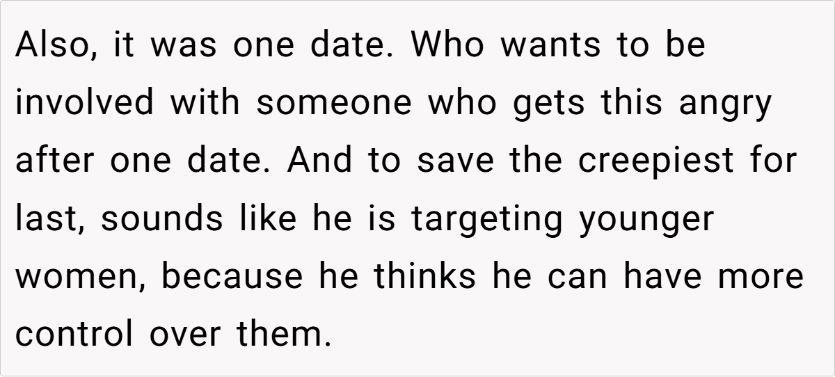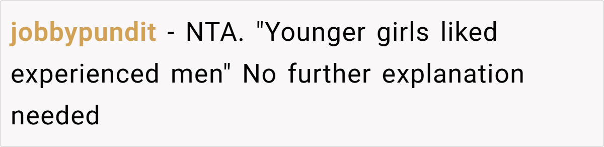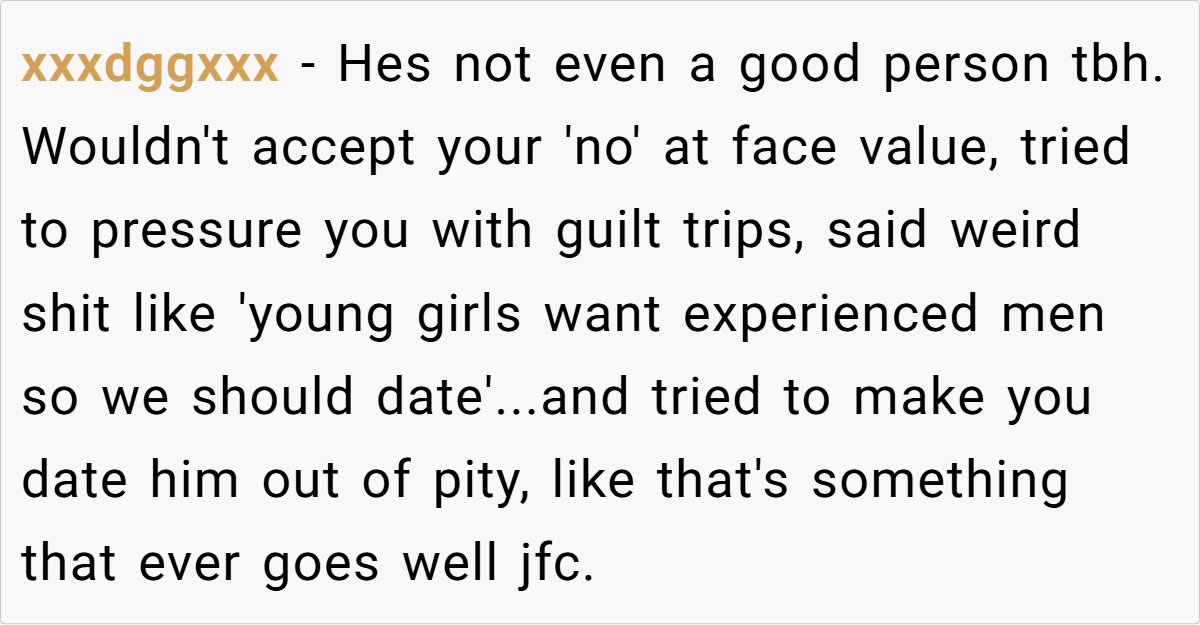 - Creepy Comments Are a Dealbreaker. The “younger girls like experienced men” remark should have been enough for OP to walk away. Any man who romanticizes a power imbalance in relationships is someone to avoid.
