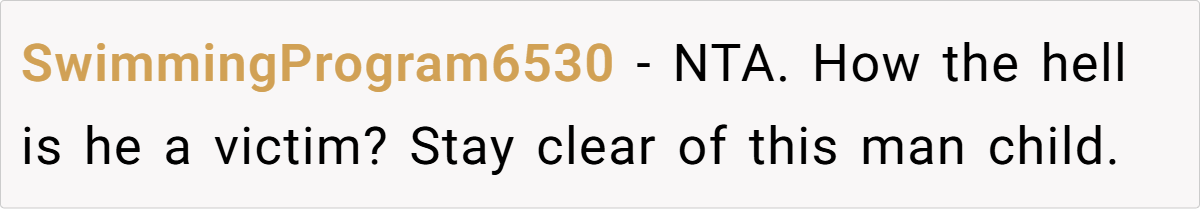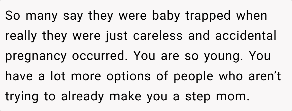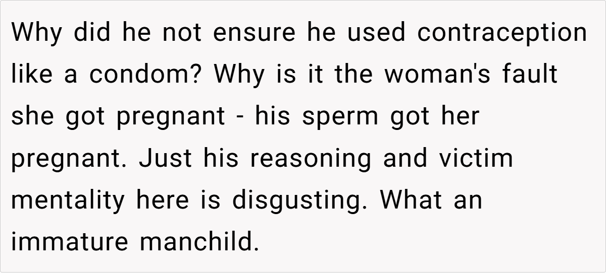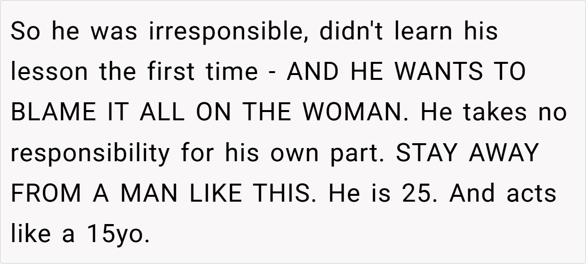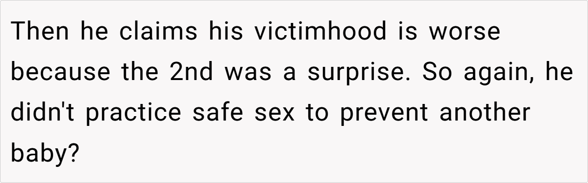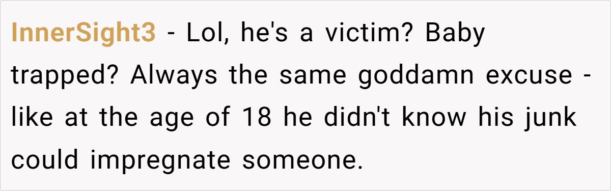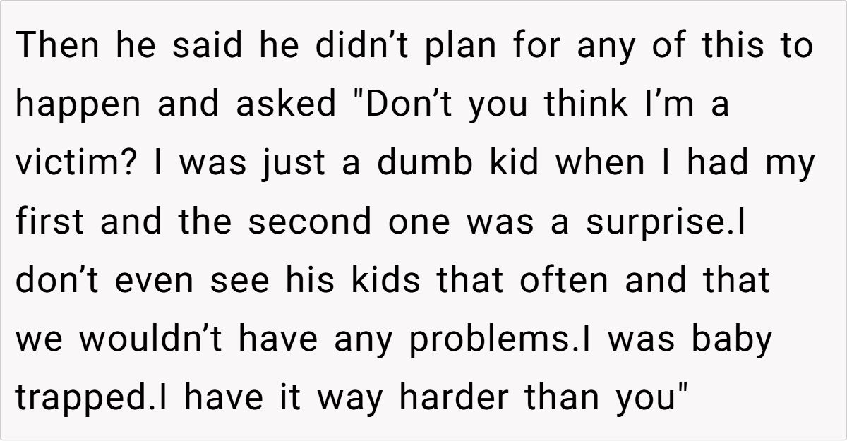 Ben’s biggest excuse? He was “baby trapped” and had it harder than OP. This is a classic victim mentality, where a person refuses to take accountability for their own choices.