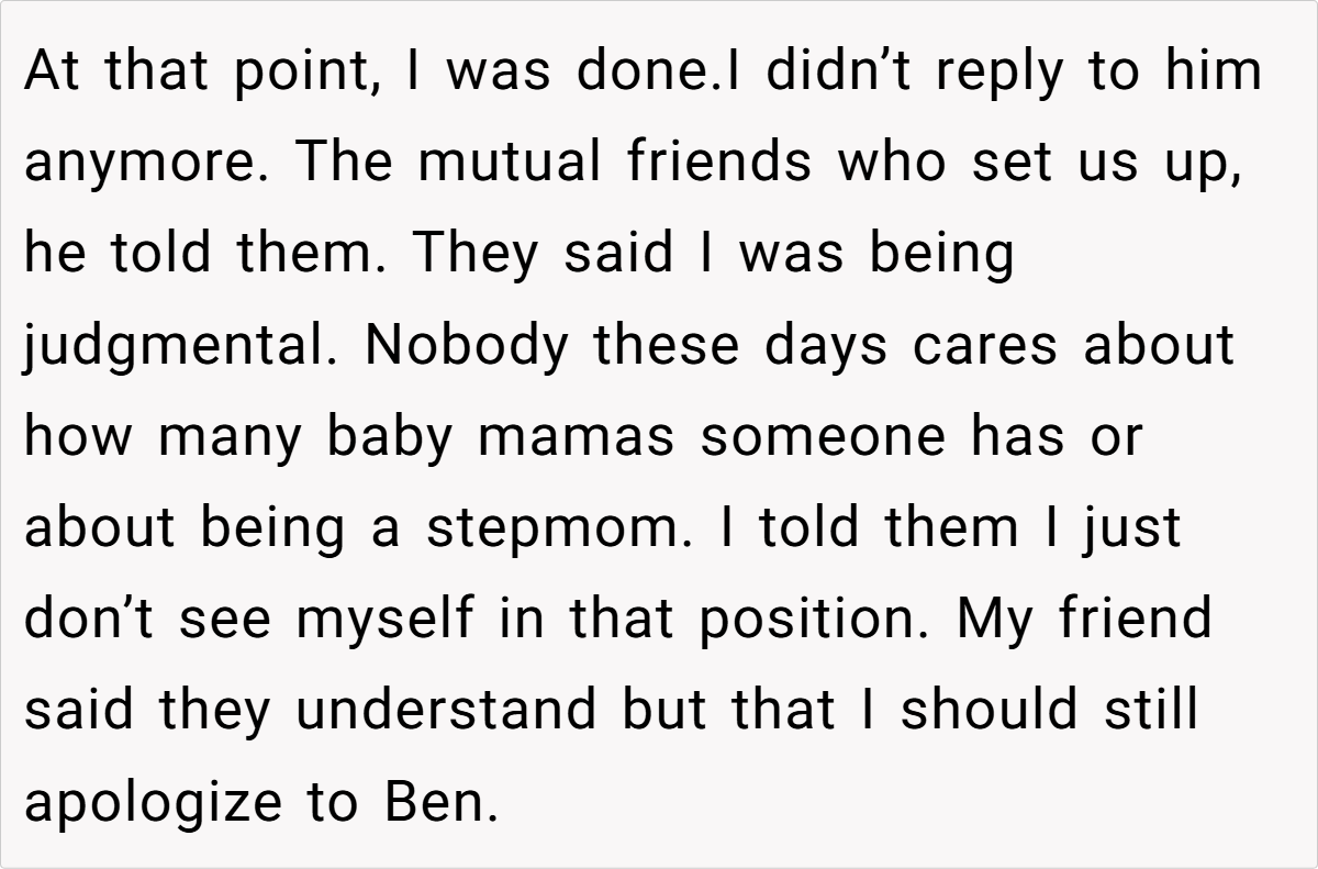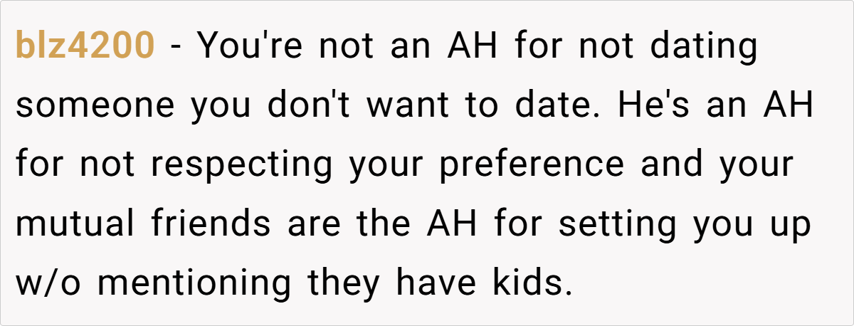 Most commenters pointed out that Ben’s reaction was the real issue here—not the fact that he had kids. Some emphasized that OP dodged a major bullet by seeing his true colors early on. Others questioned why their mutual friends were so invested in protecting Ben’s feelings over OP’s right to choose who she dates.