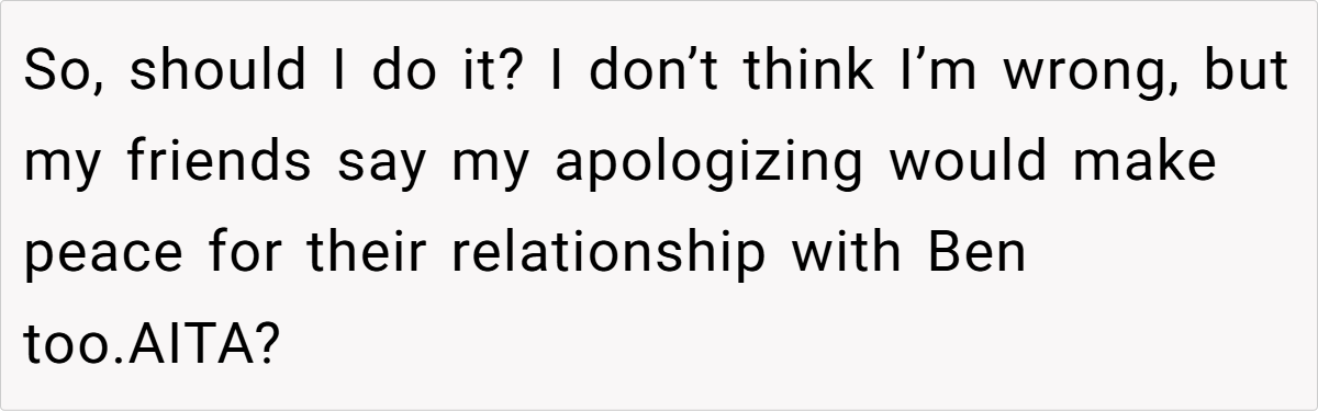 But instead of accepting her decision, Ben pushed for an explanation—and when she gave him one, he spiraled. Now, their mutual friends think she should apologize to “keep the peace,” but OP is left wondering: Why should she have to say sorry for having her own boundaries?