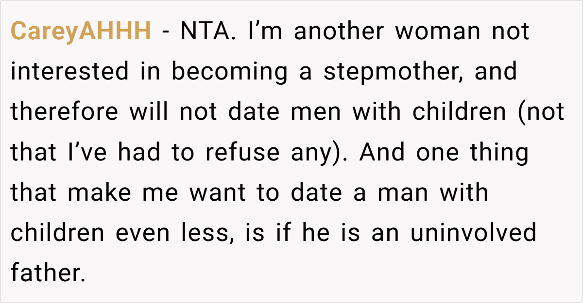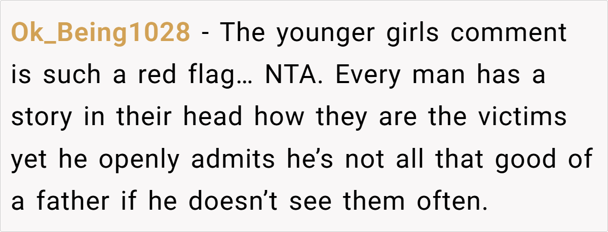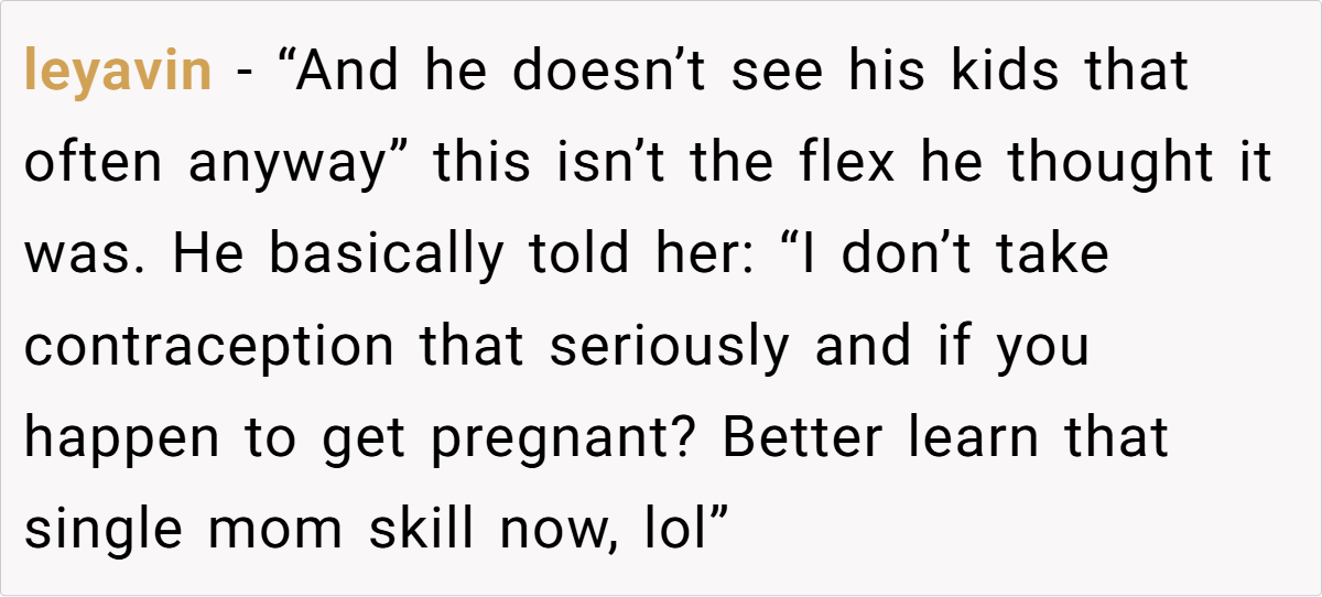 He downplayed his responsibilities as a father. Saying, “I don’t even see my kids that often” as if that would make OP feel better is not a flex—it’s a sign of irresponsibility. A good father is involved in his children’s lives, not using them as an excuse to gain sympathy.