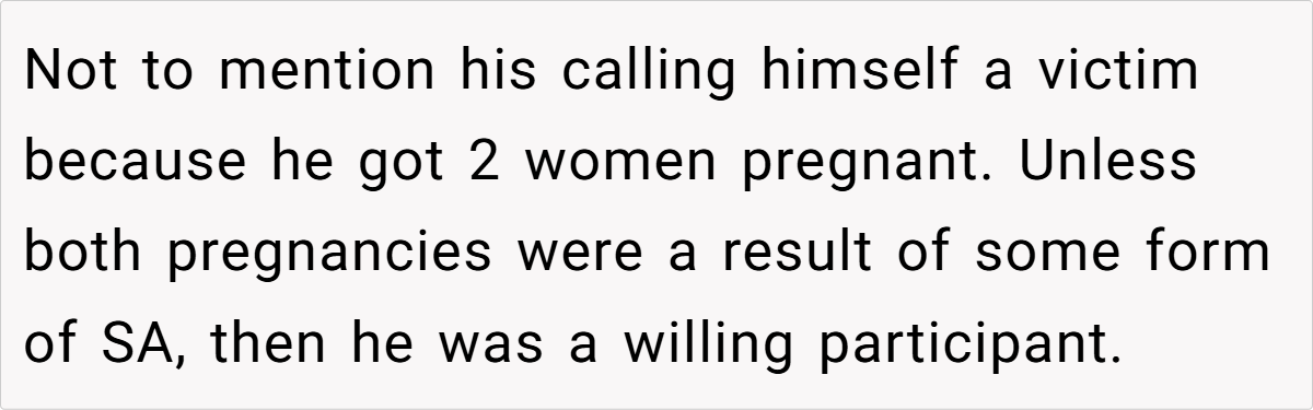 - Now, instead of acknowledging that he played an equal role in those pregnancies, he blames the women and claims he was “trapped.”