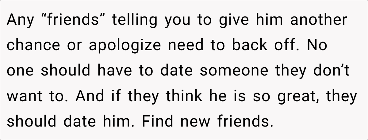 - Mutual Friends Aren’t Always Right. OP’s friends should be supporting her decision, not pressuring her to make peace with someone who refused to respect her boundaries. If they truly believe apologizing is necessary just to “keep the peace,” it may be time to reconsider these friendships.