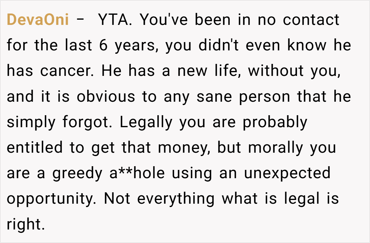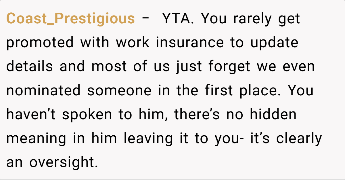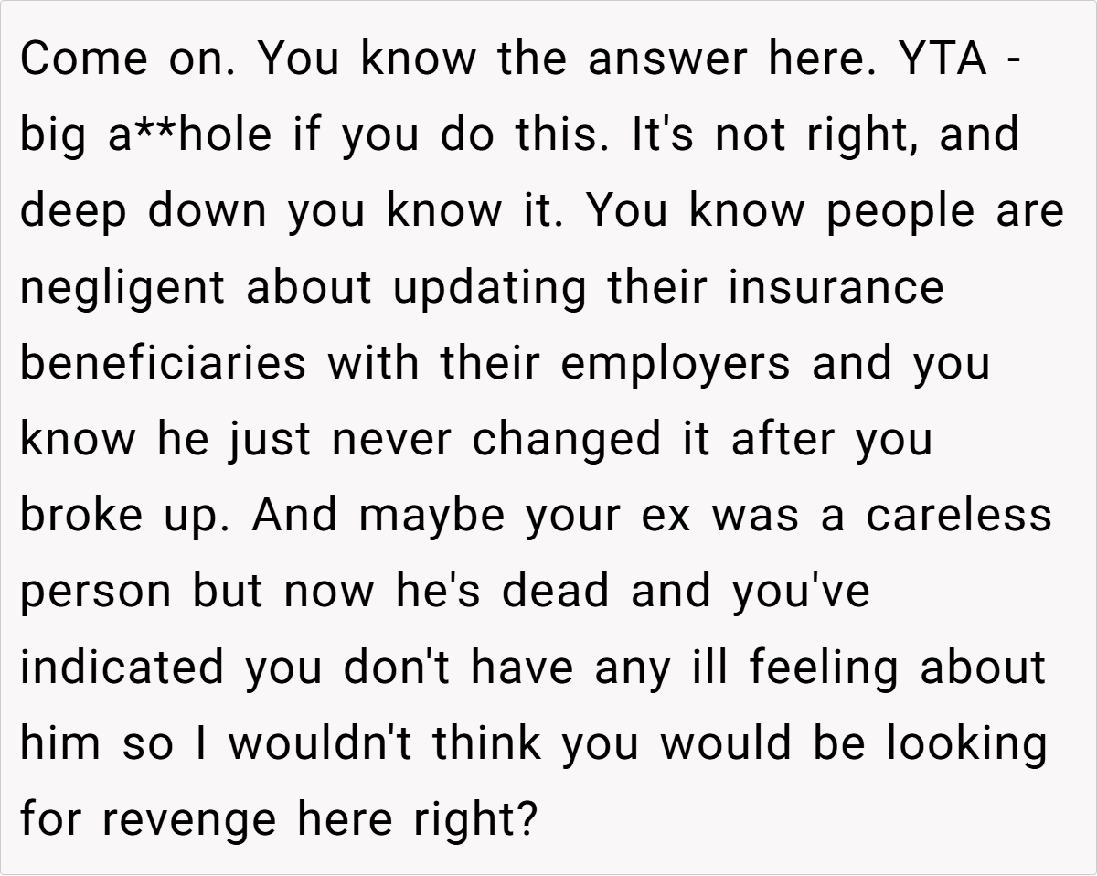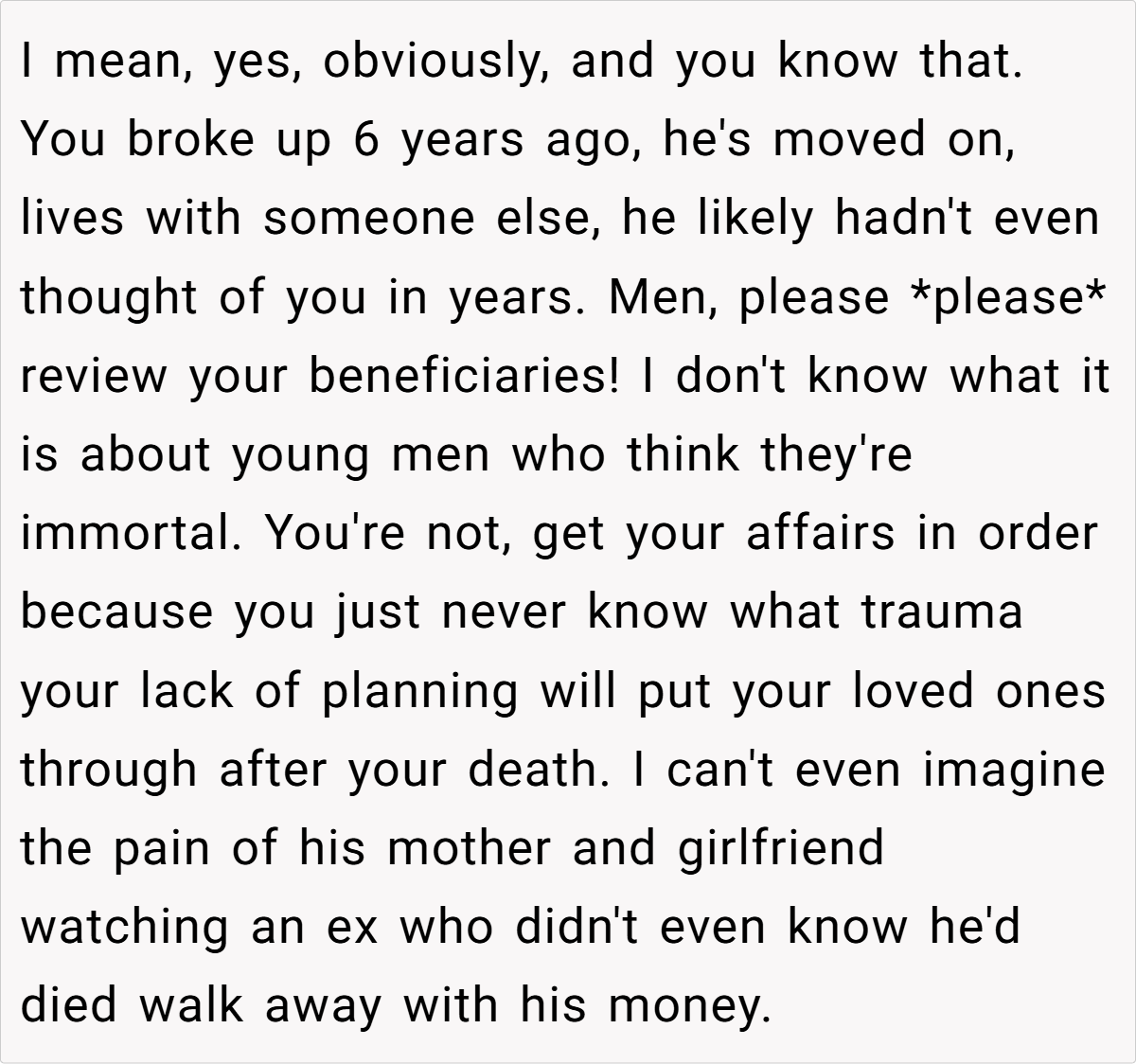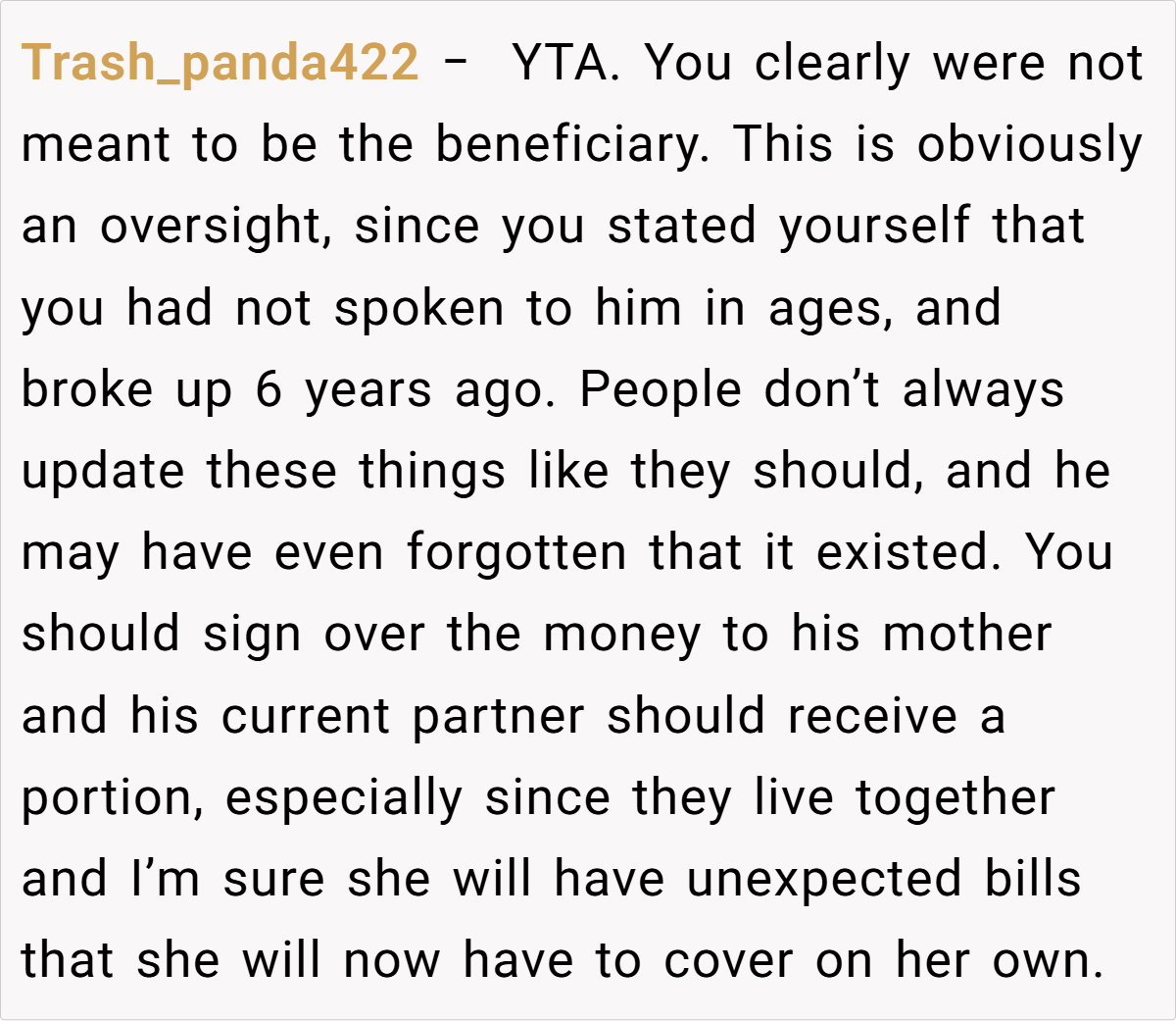 The Reddit community is divided on this issue. Many commenters argue that you should return the money, suggesting that a breakup from six years ago should preclude you from benefiting from his legacy. Others, however, note that if you’re the named beneficiary, then legally you’re entitled to it, and any oversight on his part is his responsibility. One popular comment stated, “Legally it might be yours, but morally you’re caught in a difficult spot,” while several others urged you to seek legal advice before taking any action.
