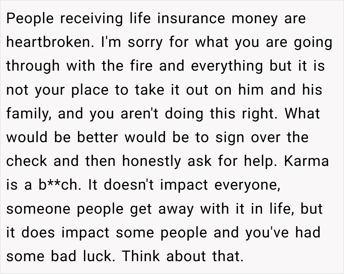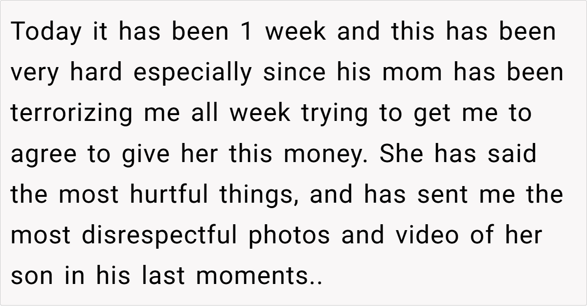 Your ex’s mother’s aggressive insistence that you sign the check over, accompanied by distressing imagery, only deepens the emotional turmoil. It suggests that the family might be trying to rewrite his last wishes, even though legally you remain a beneficiary. Before making any final decisions, it would be wise to consult with a lawyer to fully understand your rights and any potential ramifications if his current partner or family members decide to contest the designation.
