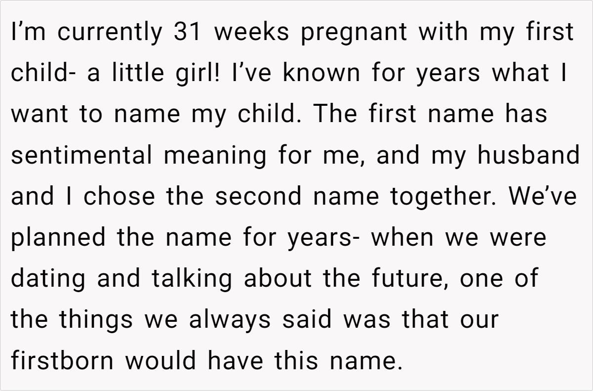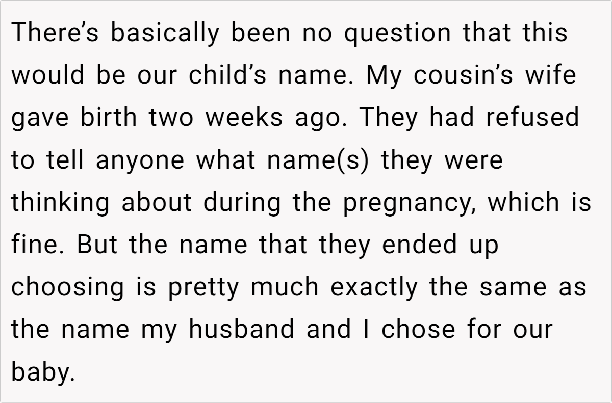 That’s exactly the situation OP (Original Poster) found herself in. After years of dreaming about a meaningful name for her first child, she was blindsided when her cousin and his wife, who had kept their name a secret, revealed they had chosen almost the same exact name for their baby. Now, tensions are high, the family is taking sides, and OP is left wondering if she’s overreacting or if she’s justified in feeling betrayed.