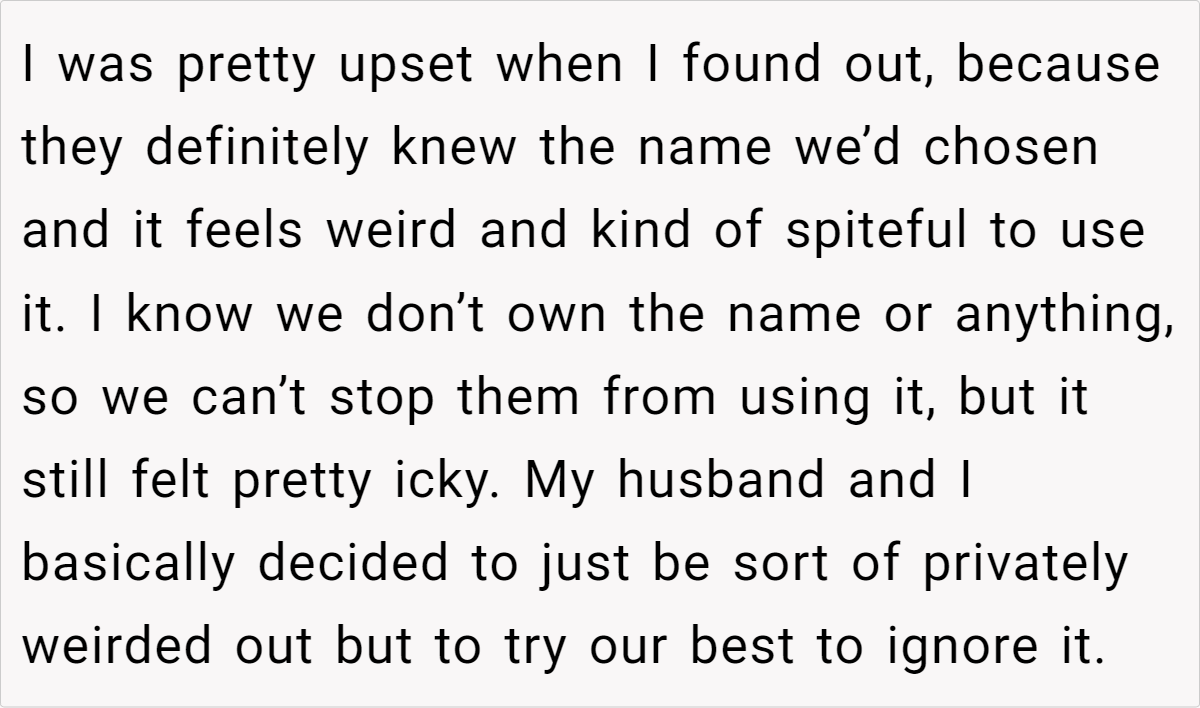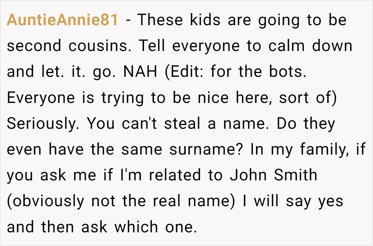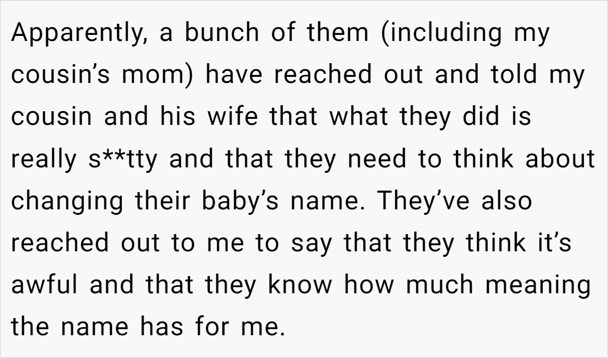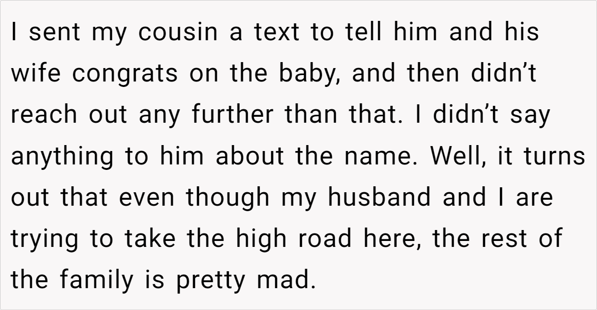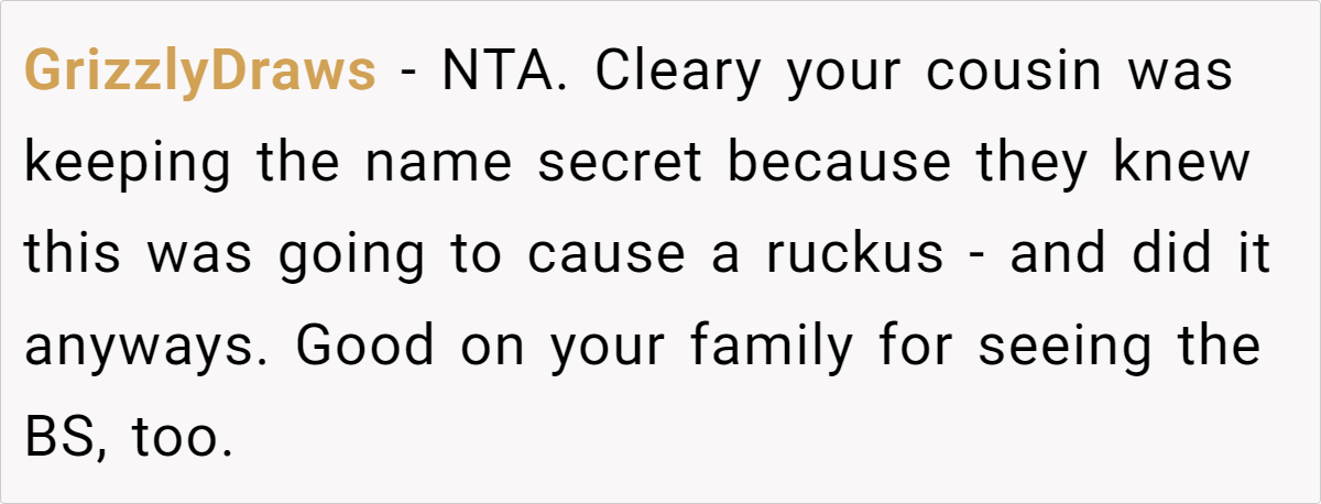 In OP’s case, she had shared the name for years, embedding it into her family’s narrative. The cousin’s secrecy about their baby’s name choice suggests they knew the potential backlash but went ahead anyway, possibly underestimating the emotional weight the name held for OP.