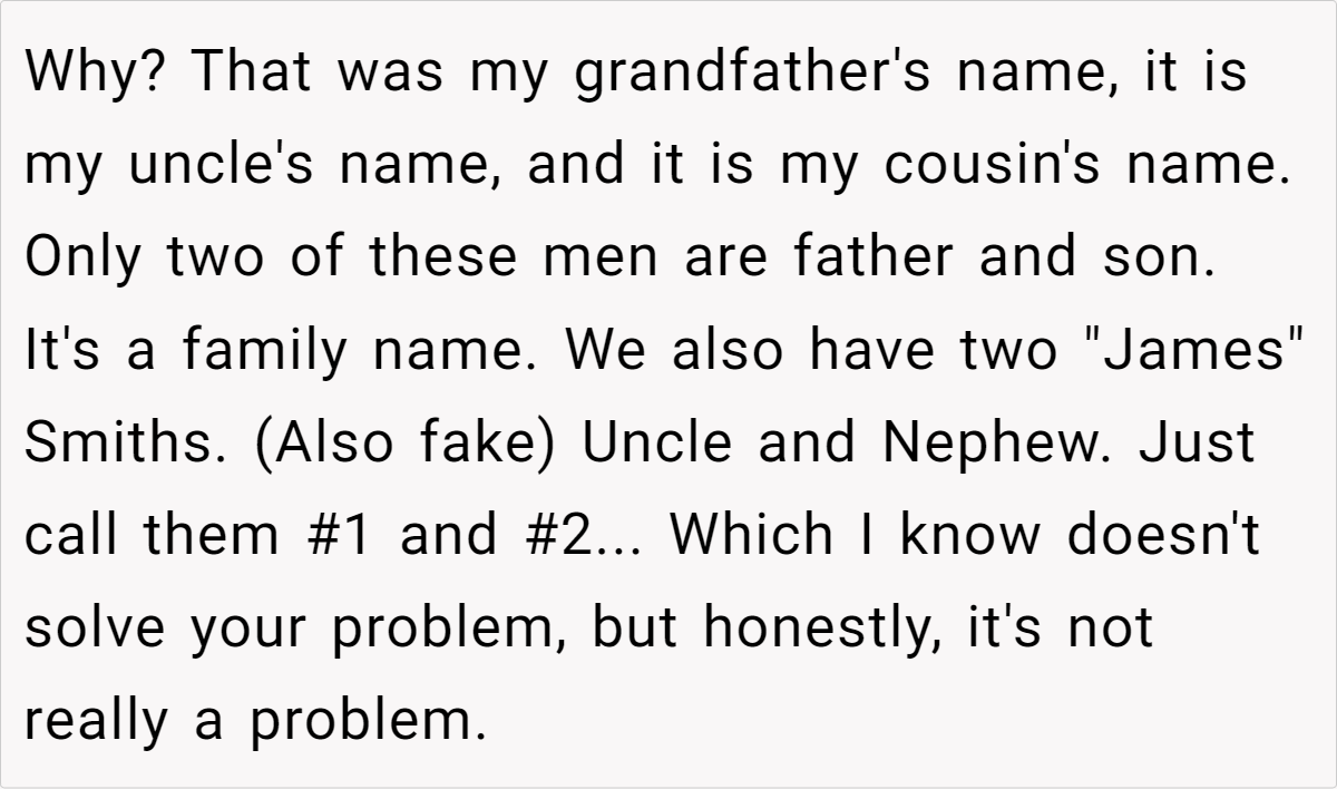 From a broader cultural perspective, some families value name-sharing as a way to honor heritage, while others view it as a breach of personal choice. The reaction often depends on the family’s dynamics and communication styles.