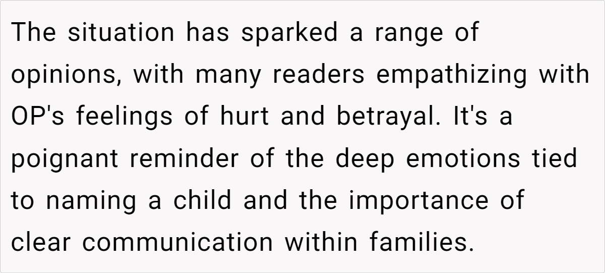 The situation has sparked a range of opinions, with many readers empathizing with OP’s feelings of hurt and betrayal. It’s a poignant reminder of the deep emotions tied to naming a child and the importance of clear communication within families.
