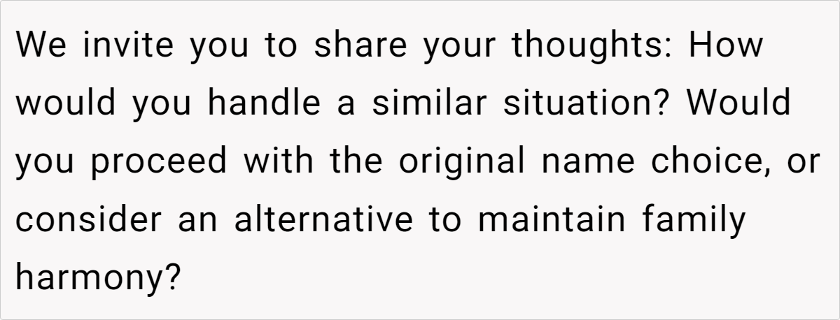 We invite you to share your thoughts: How would you handle a similar situation? Would you proceed with the original name choice, or consider an alternative to maintain family harmony?