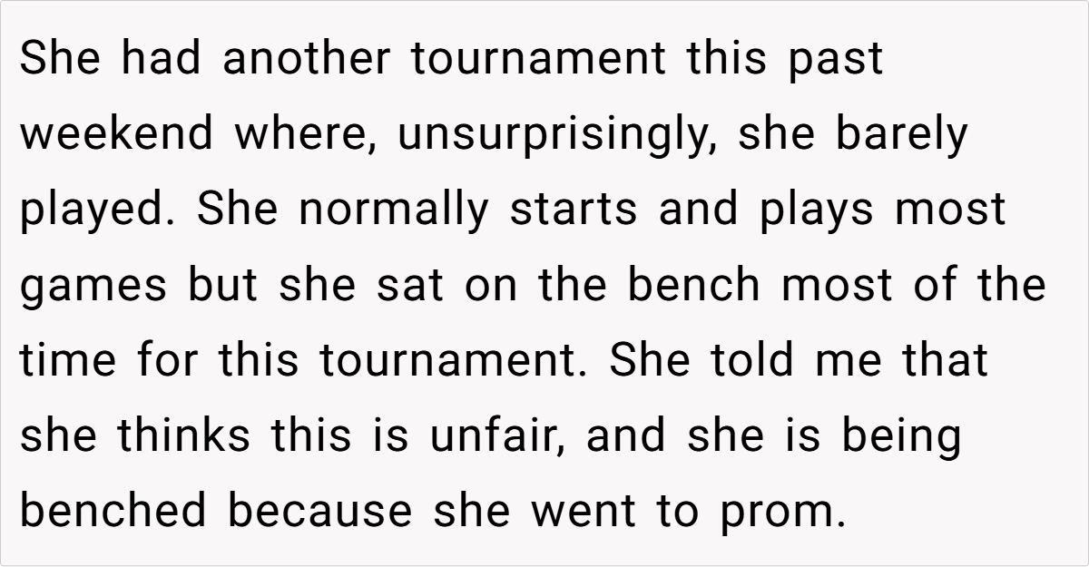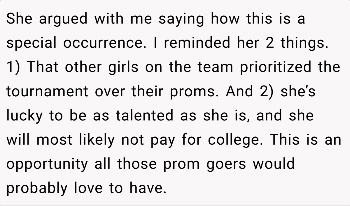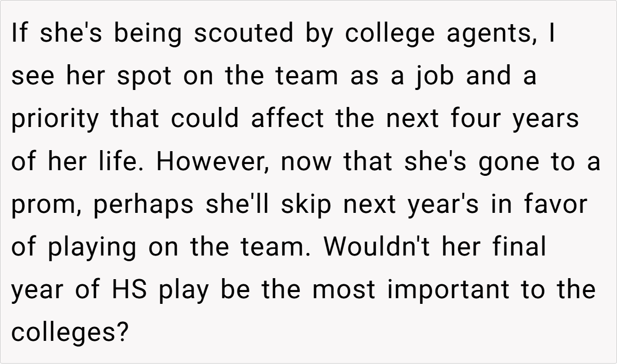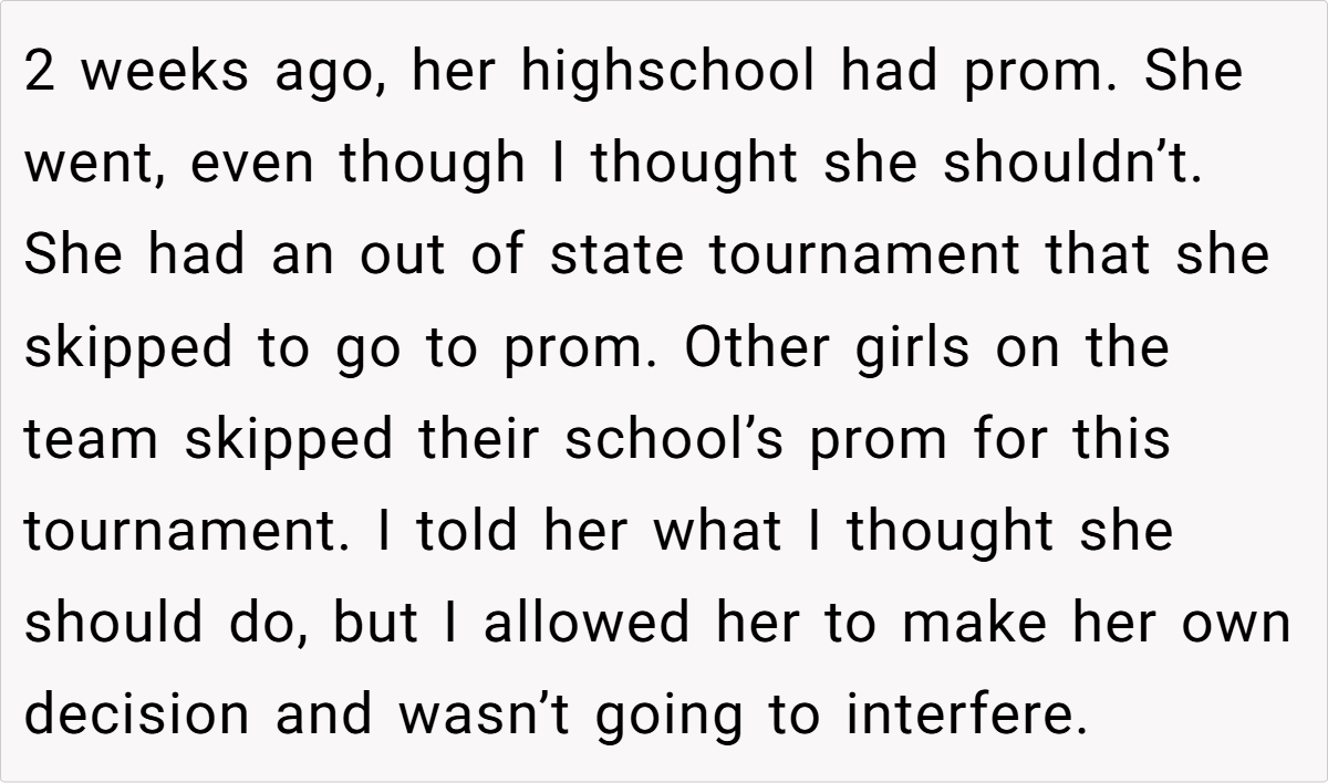 Brief Lead-in: The parent explains that despite her daughter’s excellent volleyball record and Division I prospects, her decision to attend prom—contrary to her team’s expectations—led to reduced playing time at the subsequent tournament. The parent firmly maintains that as a member of a team, commitments must be honored, while her daughter believes the incident was a special, one-time event. The ensuing debate has divided opinions at home and across the Reddit community.