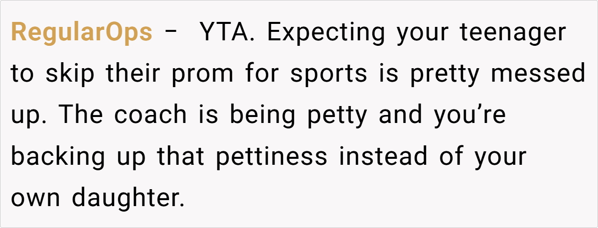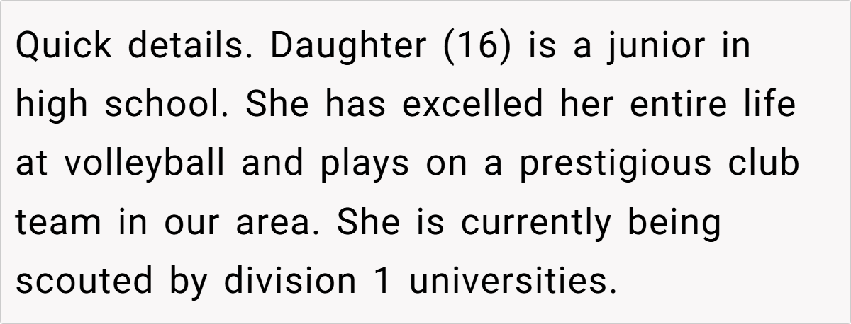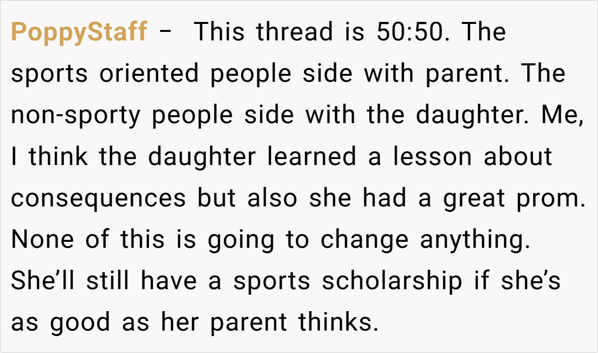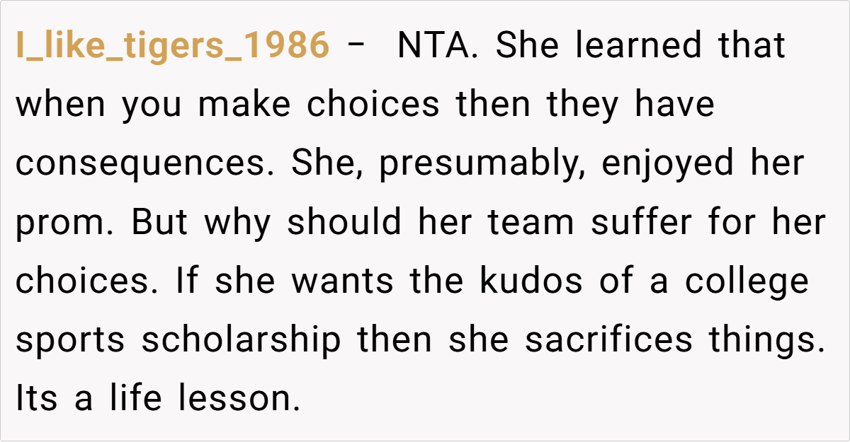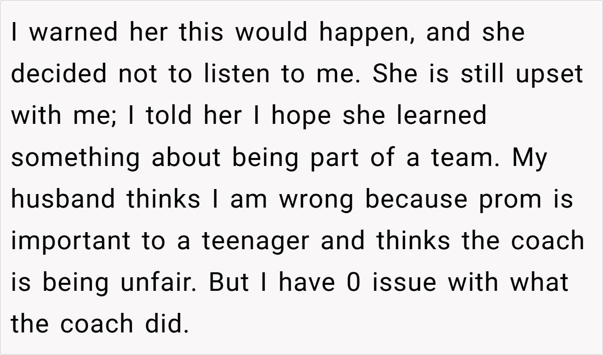 Brief Lead-in: The parent explains that despite her daughter’s excellent volleyball record and Division I prospects, her decision to attend prom—contrary to her team’s expectations—led to reduced playing time at the subsequent tournament. The parent firmly maintains that as a member of a team, commitments must be honored, while her daughter believes the incident was a special, one-time event. The ensuing debate has divided opinions at home and across the Reddit community.