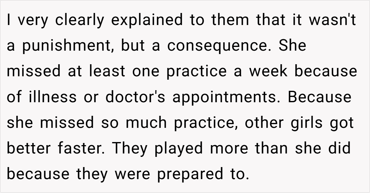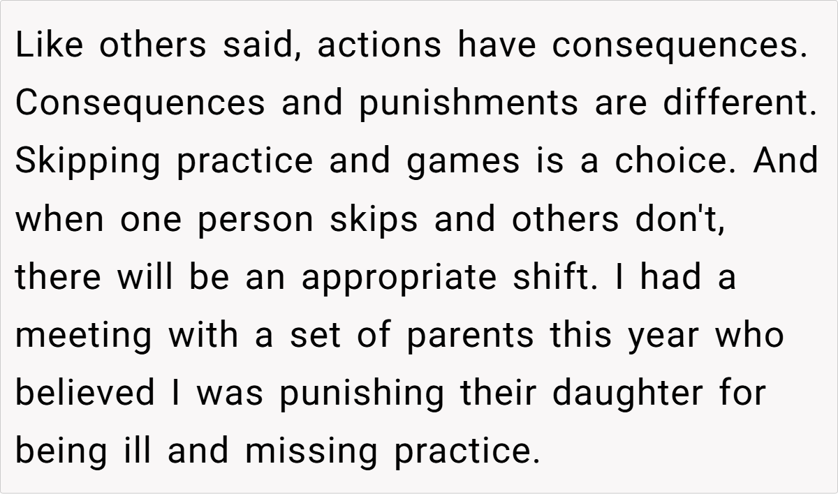 NTA. I don’t understand why so many people don’t understand why being on a team of any sort gives you a responsibility to that team, and it’s not just sports (for those who are so quick to be dismissive.) Our younger son was active in many group activities throughout high school; he was a goalie for lacrosse, played the sax in marching bands, concert band and music competitions, and was in the theater as well. Every one of these activities was his choice and every one of them relied on having all involved on board. He missed a couple of major family events because there was no back up goalie, performed his small group solo at state band comps in a foot brace just a few days after getting a really bad ankle sprain because his absence would have hurt the overall performance and missed things he would have enjoyed doing because of the many practice sessions involved for all of these activities. He also learned responsibility, the power and beauty of what a collective group can do when working together, and the importance of each individual as part of a larger group. He also made lifelong friends from these activities. Big picture, folks, big picture.