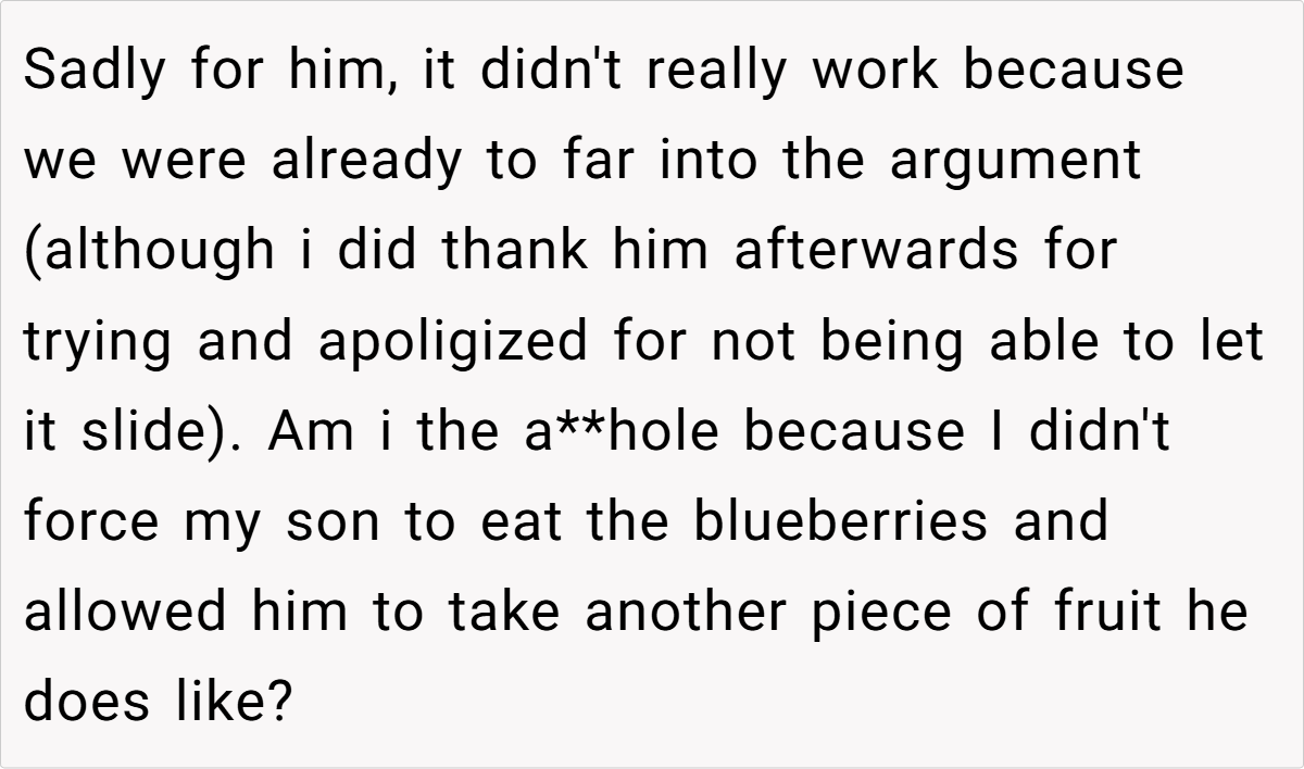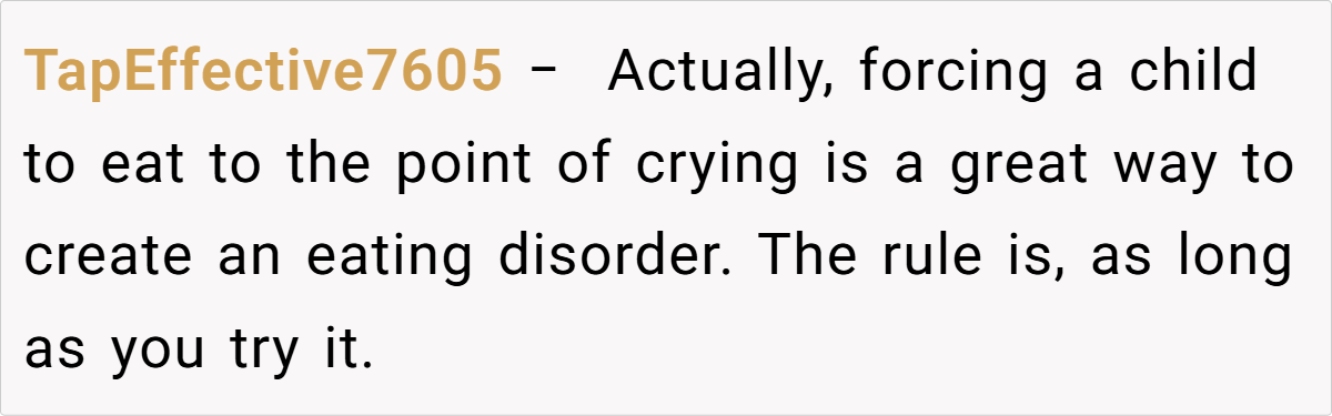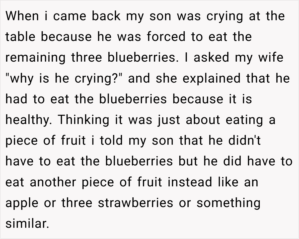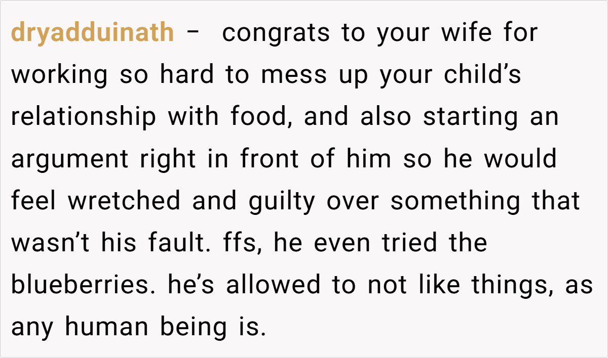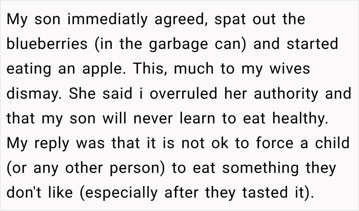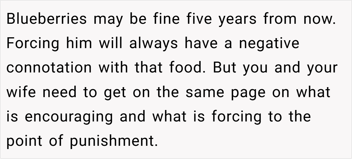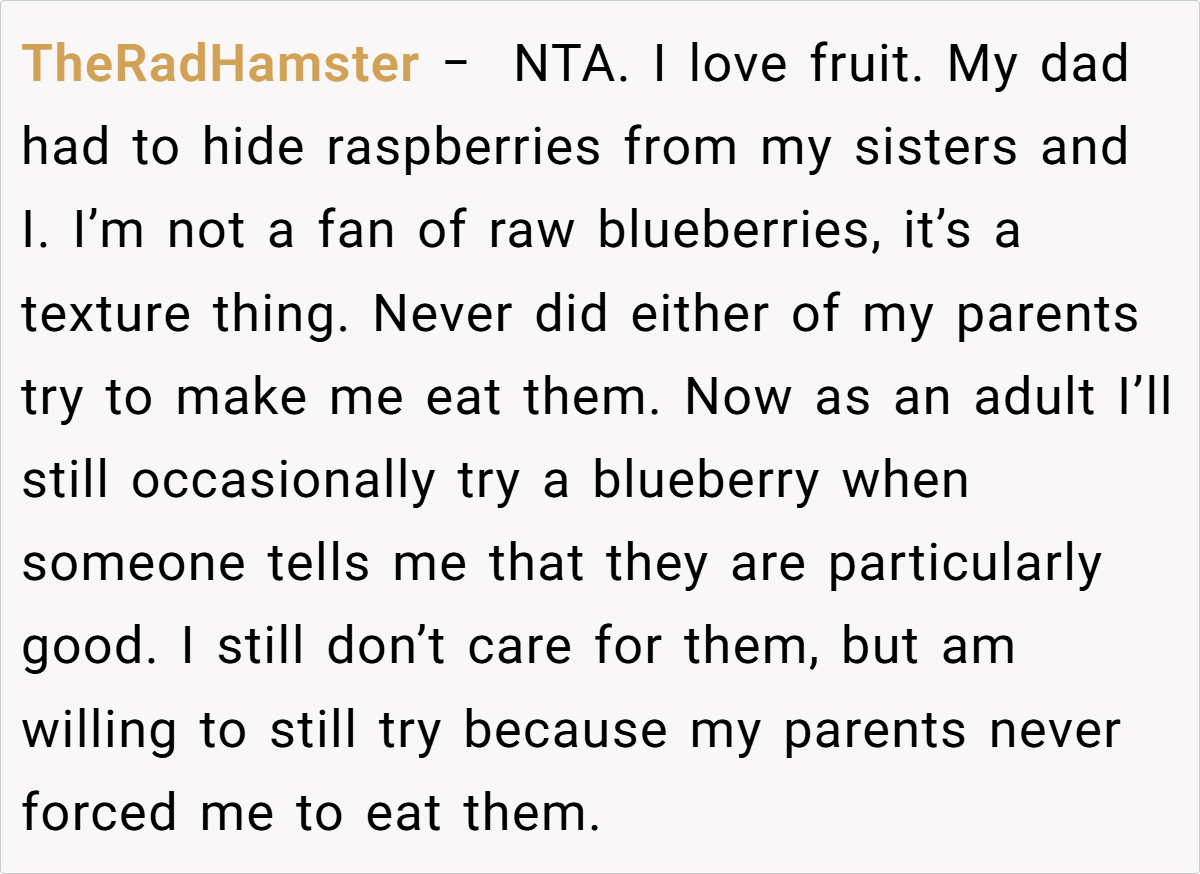 The Reddit community rallied behind the father’s decision, applauding his choice to honor his son’s dislike for blueberries. Many commented on the dangers of forcing food on children, suggesting that it can lead to negative food associations and even foster unhealthy eating habits. The consensus was that flexibility in mealtime can help prevent power struggles and promote a more enjoyable, stress-free dining experience for everyone involved.