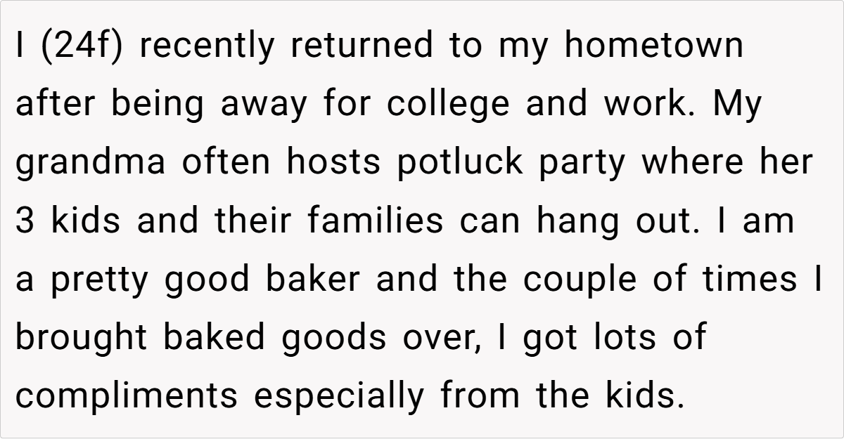 Family potlucks are usually a time for warm gatherings and delicious treats, but sometimes, even the sweetest moments can turn sour. In this story, a 24-year-old baker returned to her hometown and was excited to share her elaborate cupcakes at her grandma’s annual potluck.