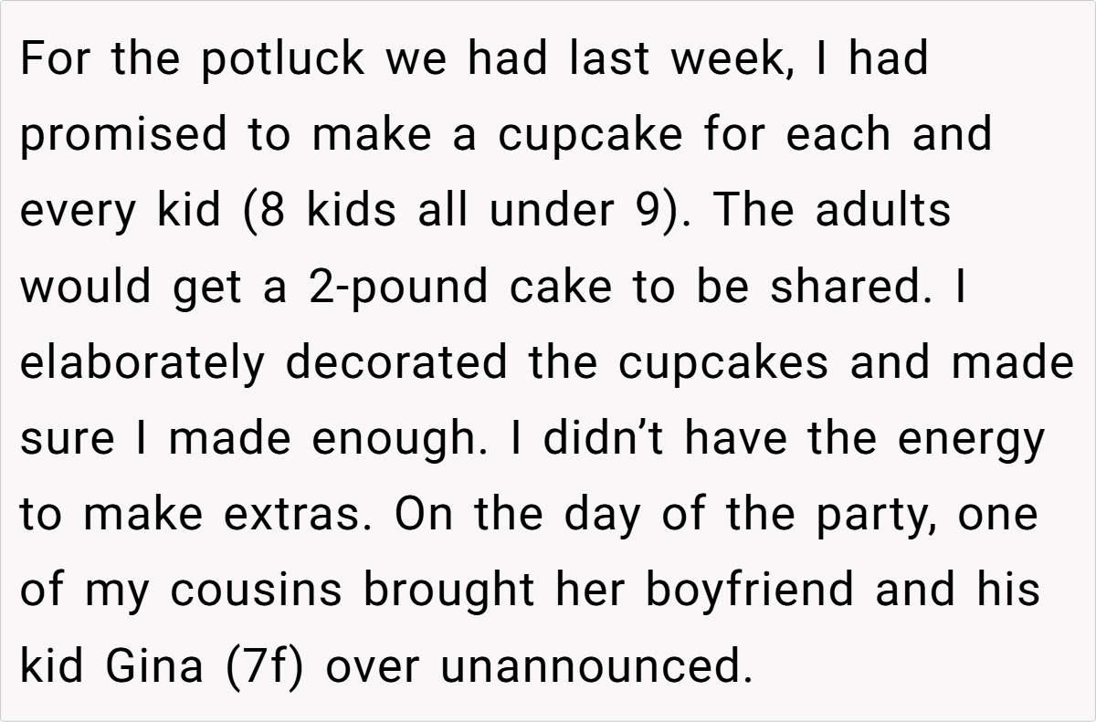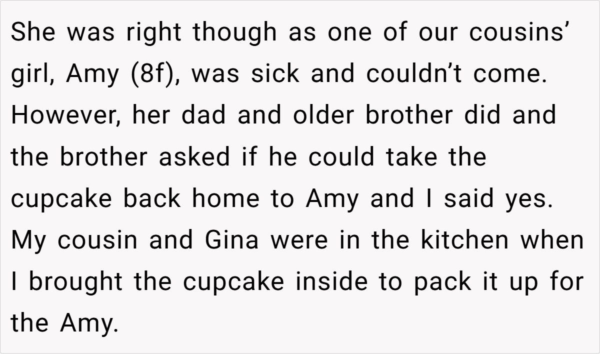 However, things took an unexpected turn when an unplanned guest showed up. At the party, a cousin arrived with her boyfriend and his daughter, Gina—a seven-year-old who wasn’t on the original guest list. When Gina asked for a cupcake, the baker was forced to stick to her promise. This decision, though rooted in commitment and fairness, sparked a heated debate about responsibility, entitlement, and the true meaning of hospitality.
