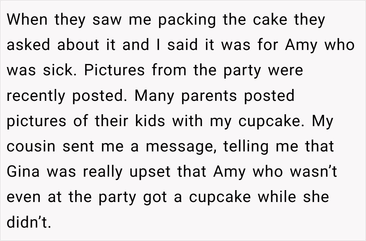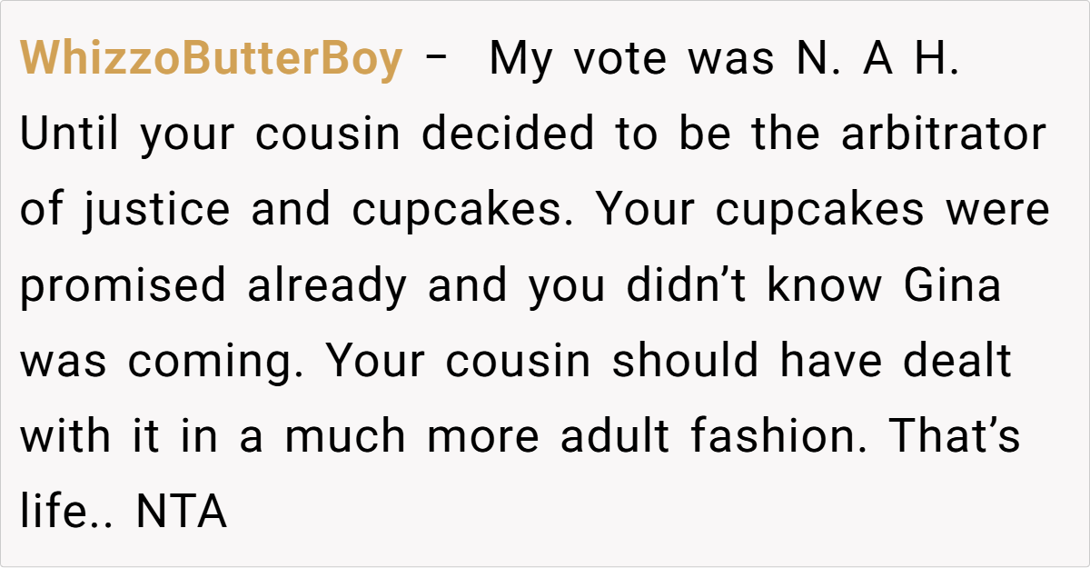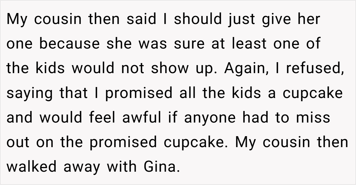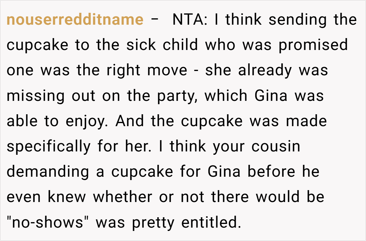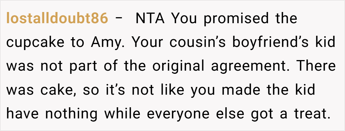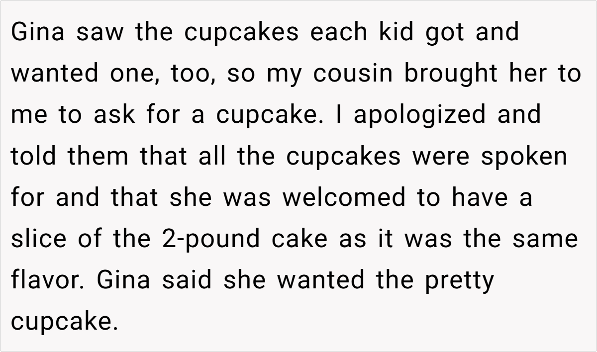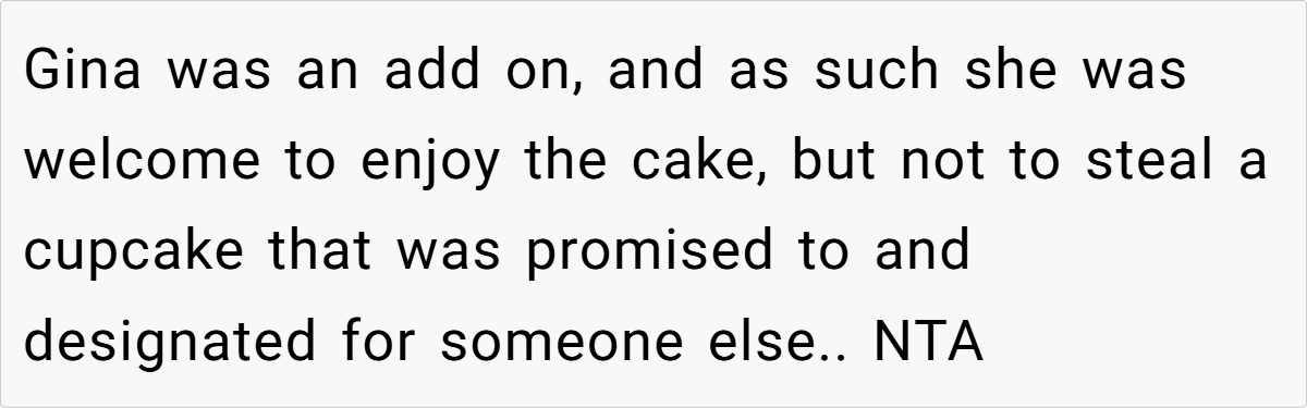 Reddit users largely rallied behind the baker’s decision. Many pointed out that since Gina was not on the guest list and the cupcakes were explicitly promised to the eight designated children, it was completely fair for her to receive an alternative treat.