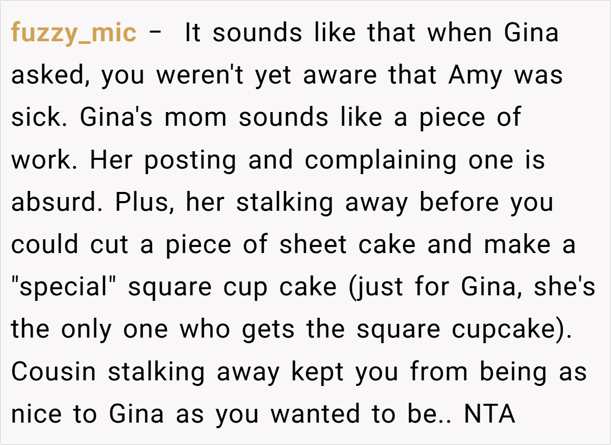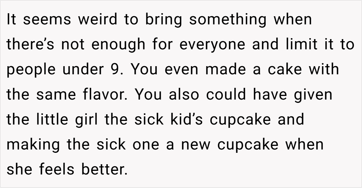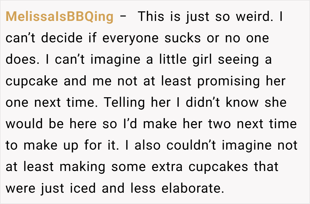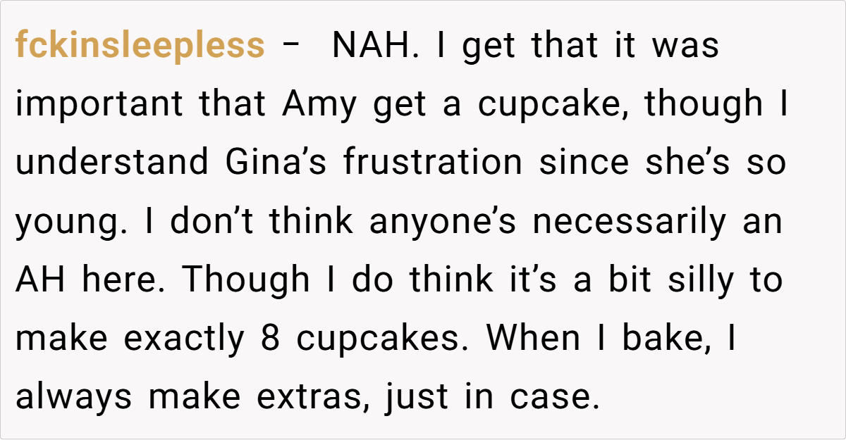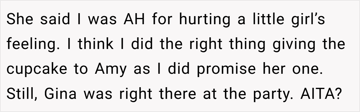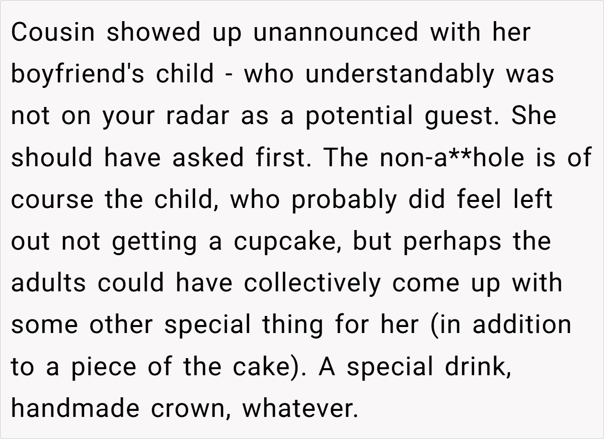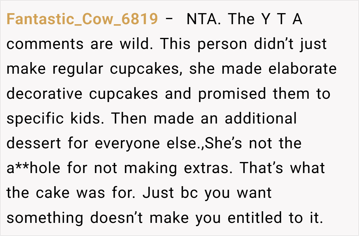 Reddit users largely rallied behind the baker’s decision. Many pointed out that since Gina was not on the guest list and the cupcakes were explicitly promised to the eight designated children, it was completely fair for her to receive an alternative treat.