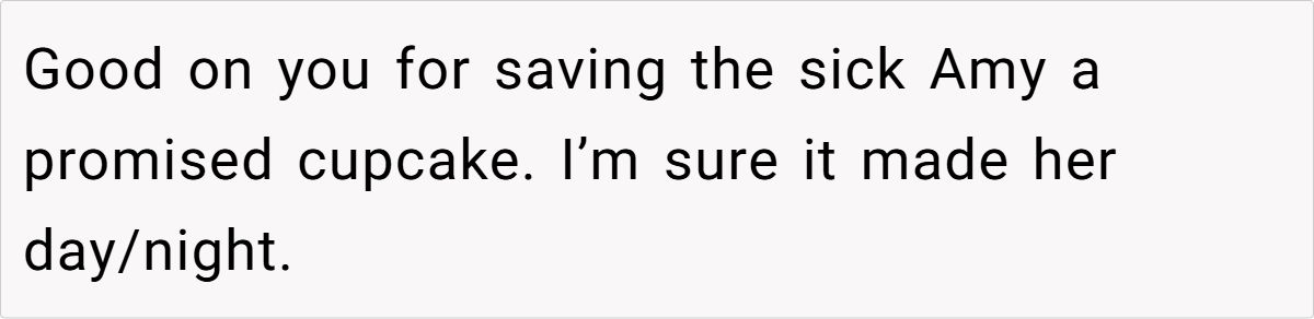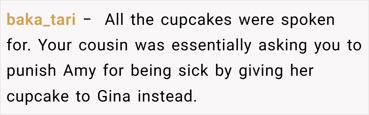 The situation becomes even more complex when a twist arises: one of the promised children, Amy, was unable to attend due to illness. With the cupcake reserved for Amy being redirected to her by a family member, the baker was left with no wiggle room to cater to Gina’s request. Thus, the baker’s firm decision reflects a balance between fairness to those originally promised and the practical limits of what she could reasonably provide.