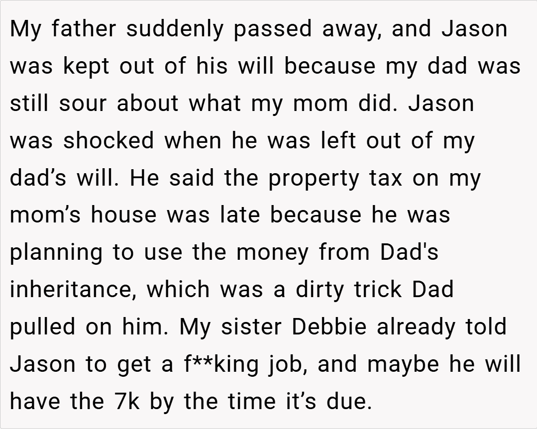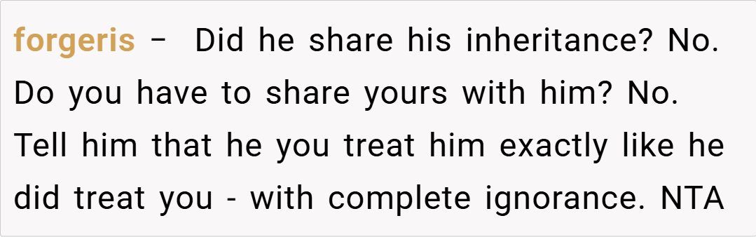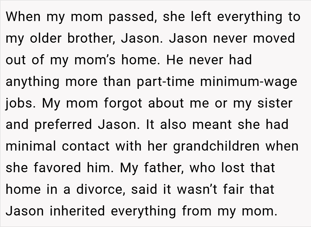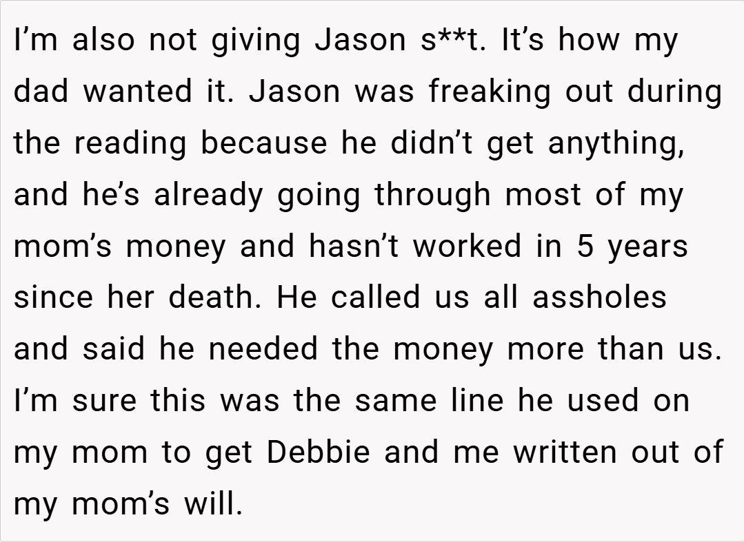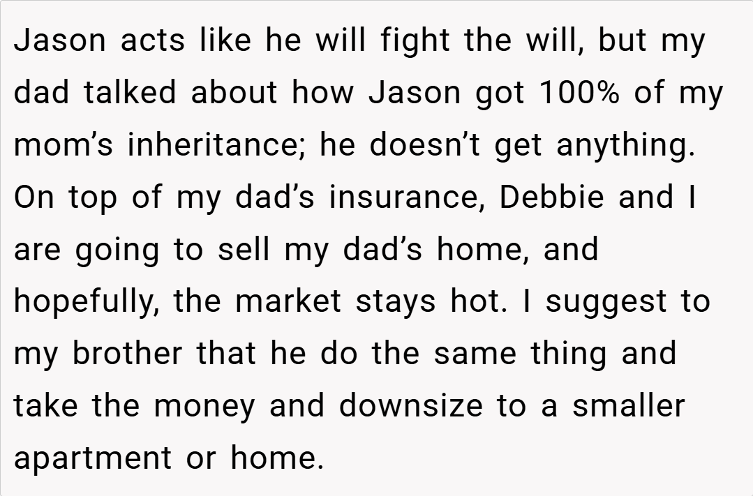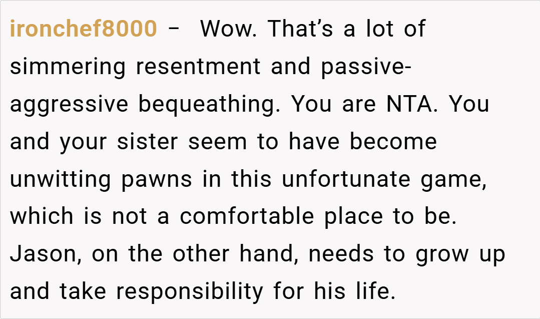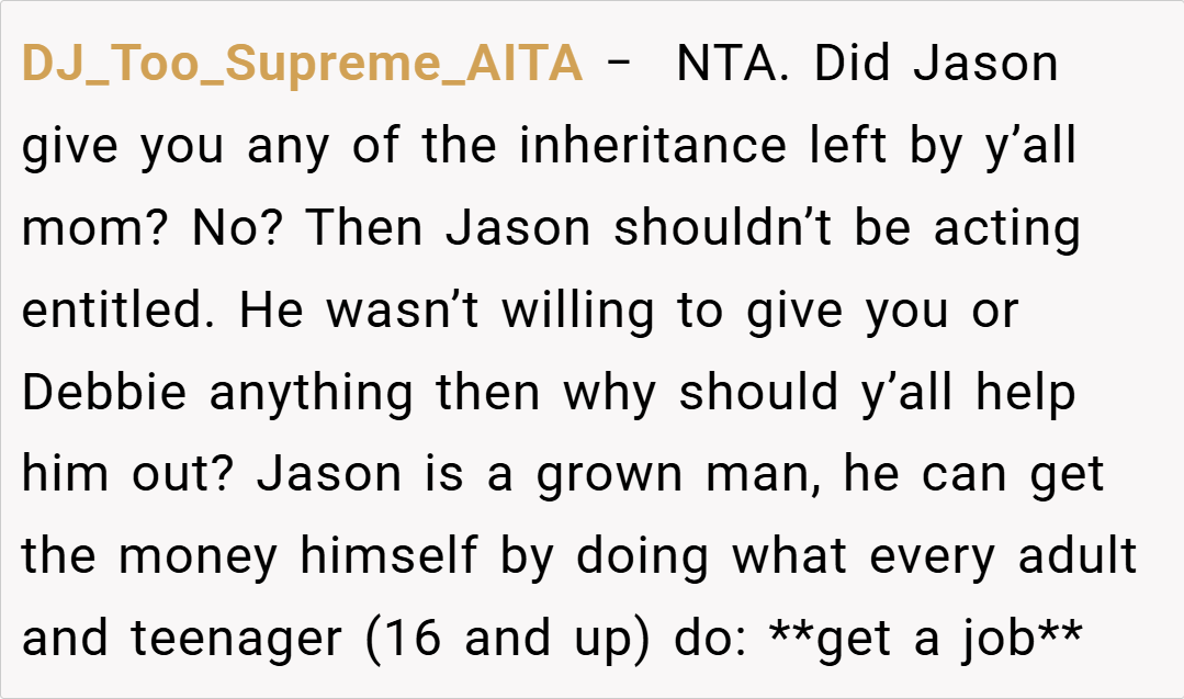 Here are some hot takes from the Reddit community—candid and unfiltered. One user remarked that Jason’s behavior is “wildly unrealistic and short-sighted,” insisting that he should “get a job” instead of banking on future windfalls. Another commenter pointed out that the narrator’s refusal to share their inheritance is a justified reaction to years of unequal treatment and misplaced entitlement.
