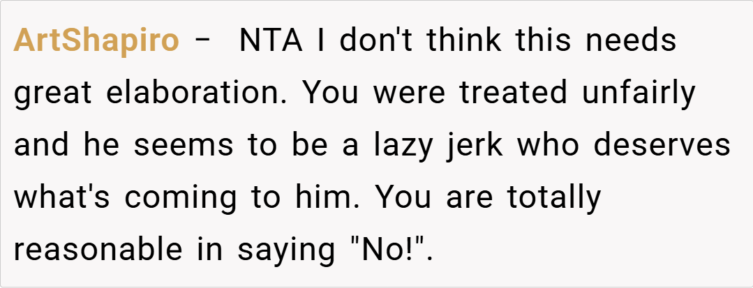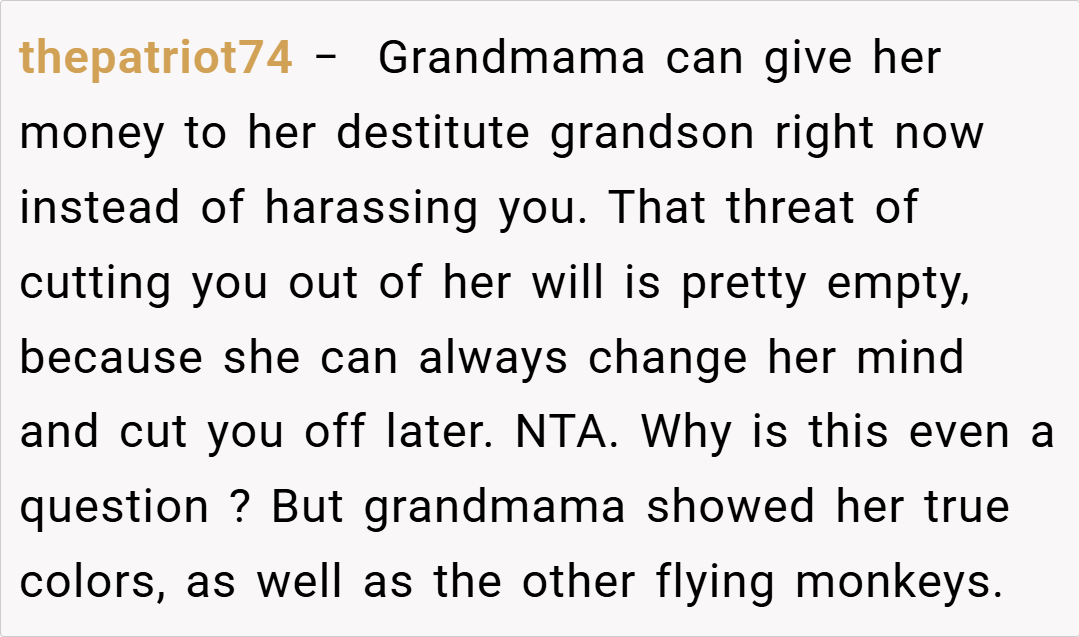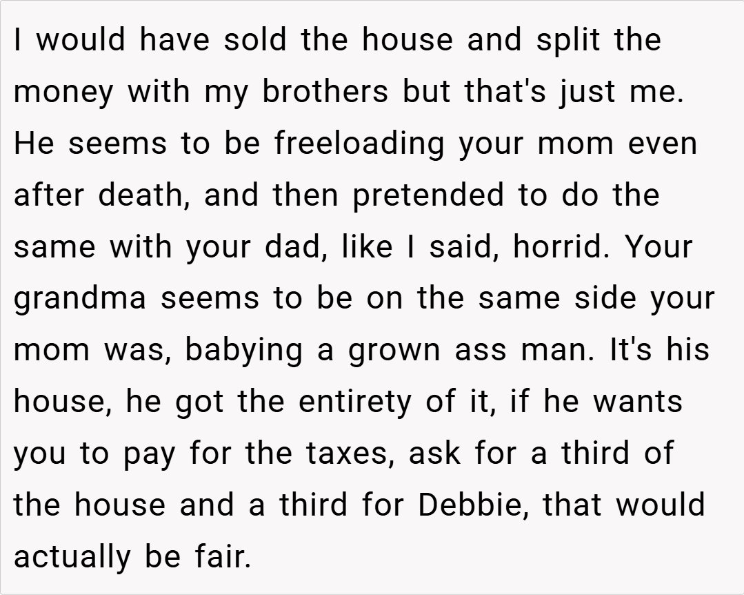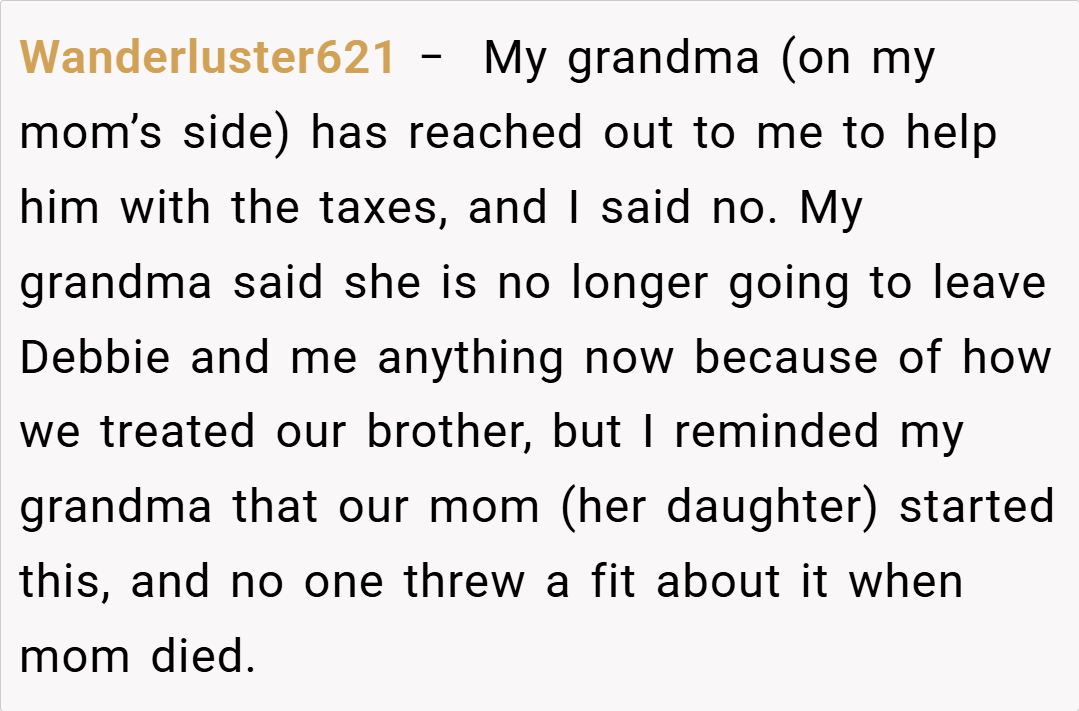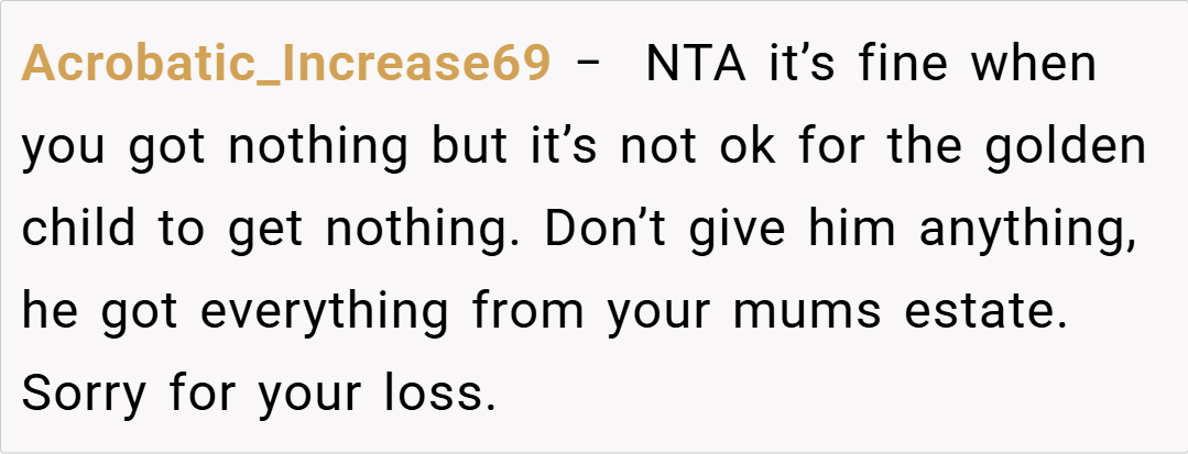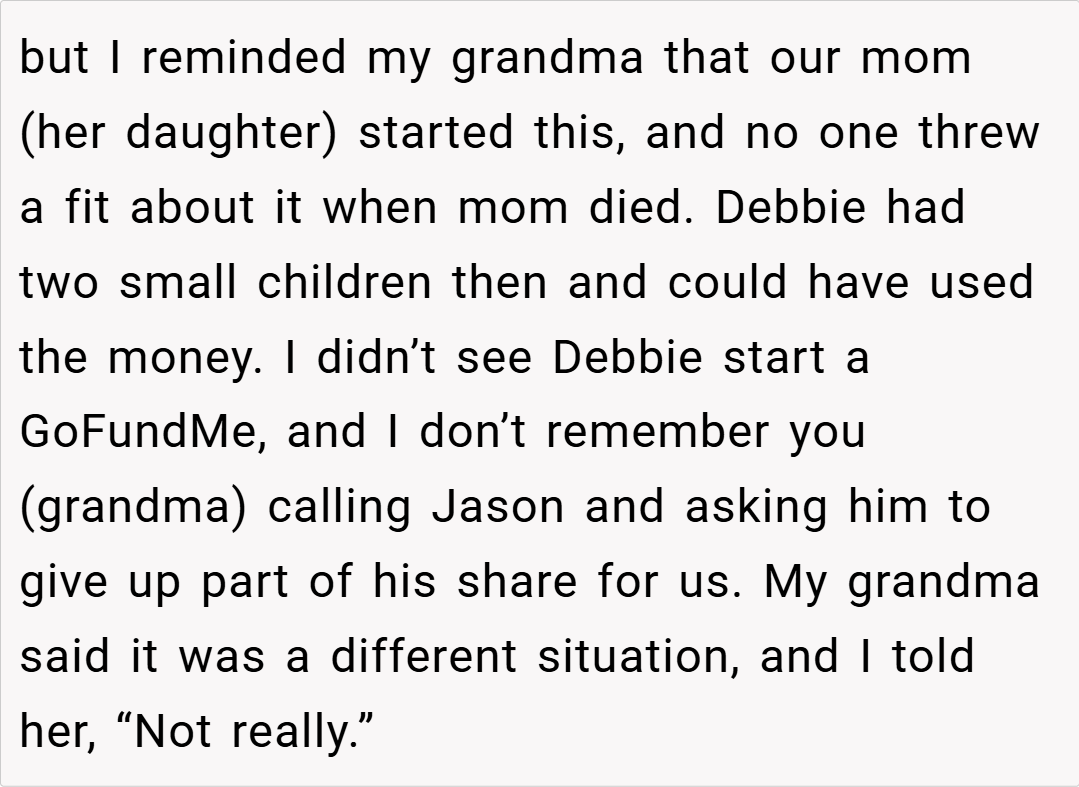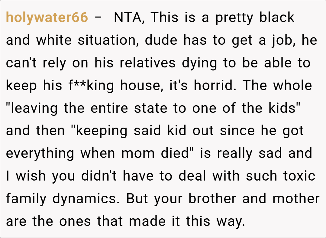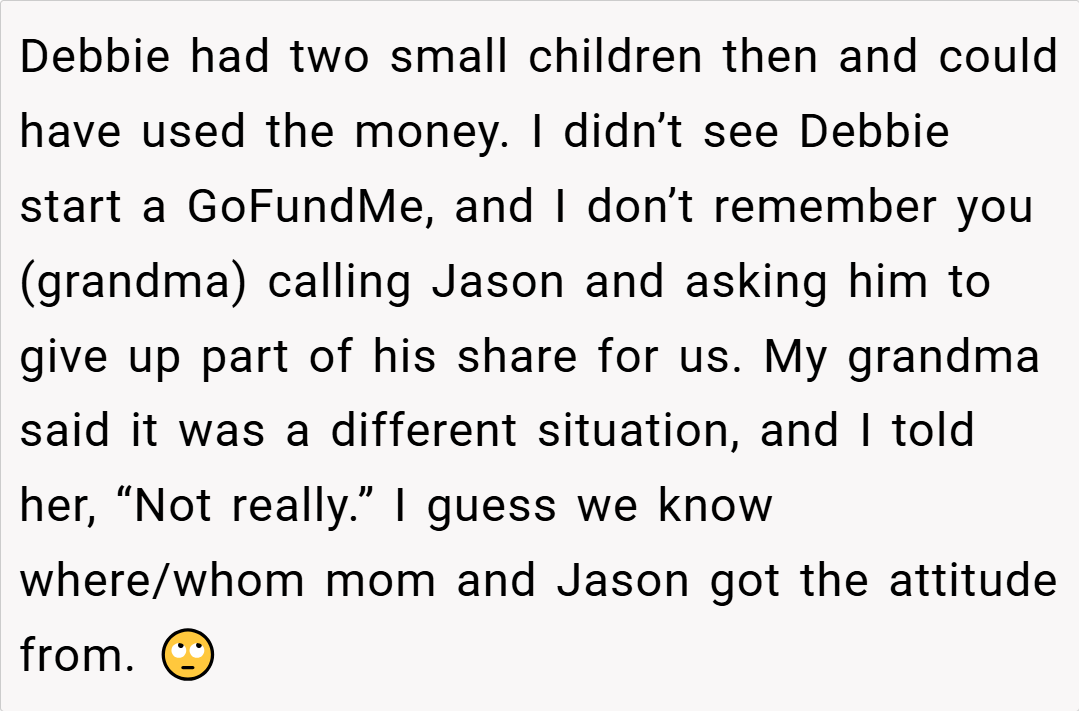 Here are some hot takes from the Reddit community—candid and unfiltered. One user remarked that Jason’s behavior is “wildly unrealistic and short-sighted,” insisting that he should “get a job” instead of banking on future windfalls. Another commenter pointed out that the narrator’s refusal to share their inheritance is a justified reaction to years of unequal treatment and misplaced entitlement.