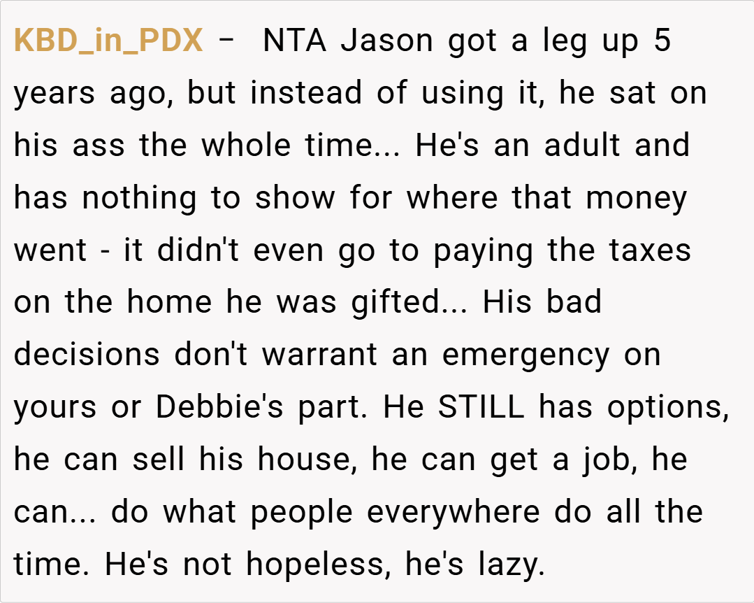 A third contributor summed it up by calling Jason “a lazy jerk who deserves what’s coming to him.” Overall, the prevailing sentiment among commenters is that family funds should not be used to cover the expenses of someone who has consistently chosen irresponsibility over accountability