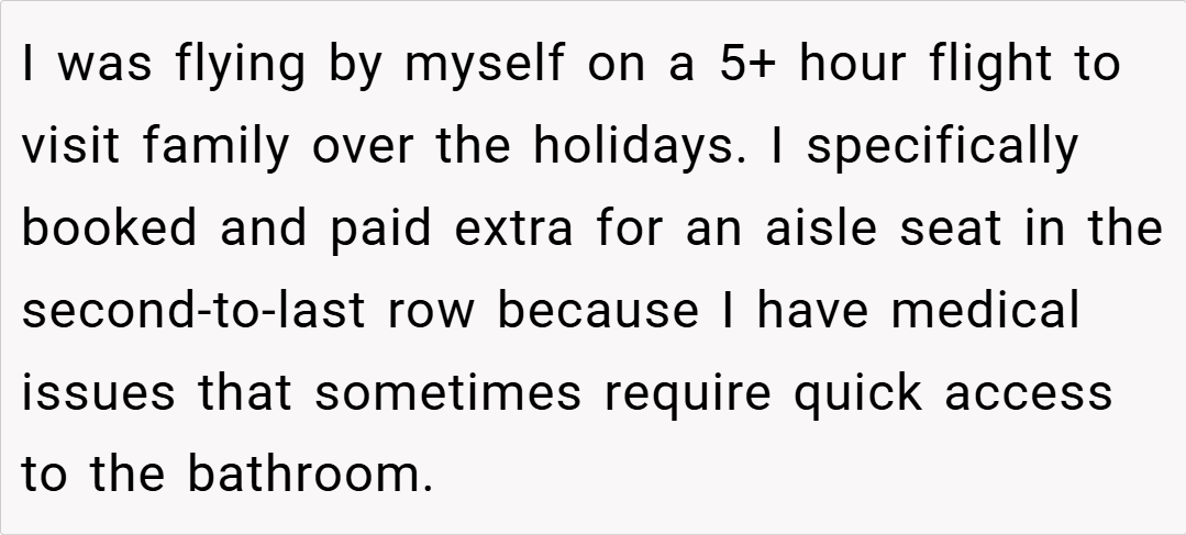 Amid the holiday rush and the challenges of air travel, one passenger’s decision to stick with her pre-booked aisle seat has sparked a spirited debate. With a 5+ hour flight and the need for quick access to the restroom due to a documented medical condition, this individual had paid extra for a specific seat.