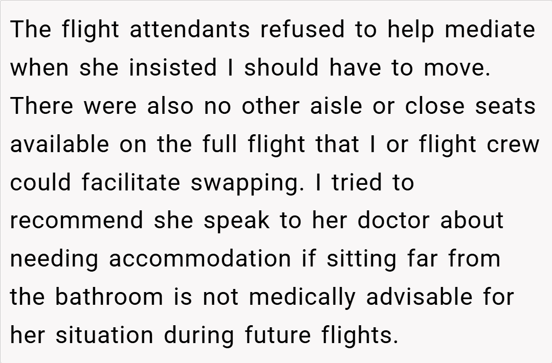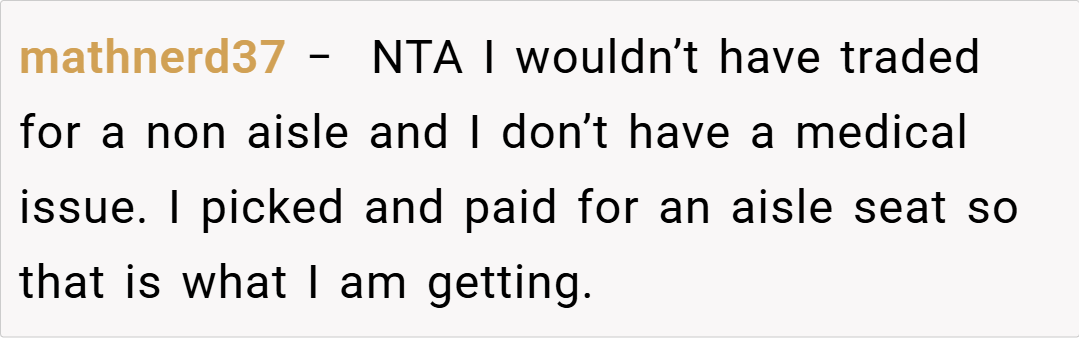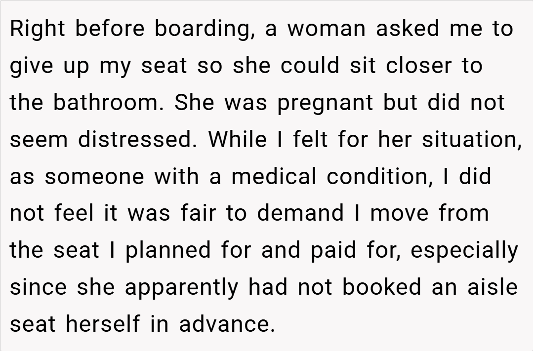 Navigating air travel often requires balancing personal needs with the unwritten rules of courtesy among passengers. In this case, the decision to keep a specifically booked aisle seat—purchased to manage a medical condition—highlights the importance of adhering to the terms of one’s travel arrangement.