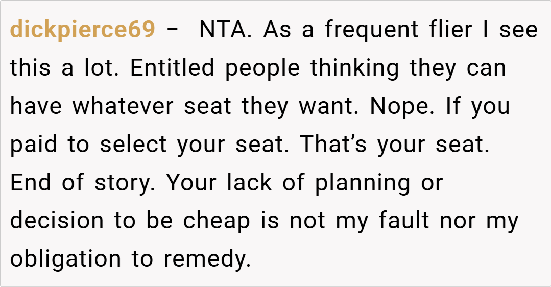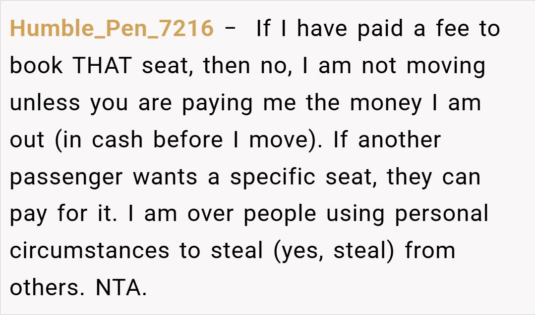 This concise insight reinforces the idea that when a passenger invests in a specific seating arrangement to manage health concerns, that selection is more than a preference—it is a necessary provision that should be respected. The expert’s perspective draws attention to the contractual nature of airline bookings, suggesting that any mid-flight requests for a seat change undermine this binding agreement.