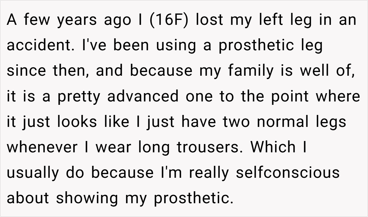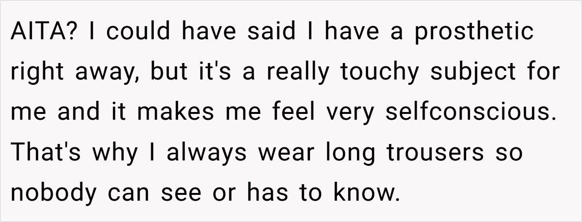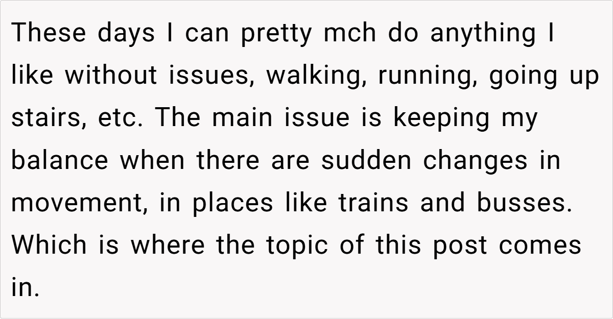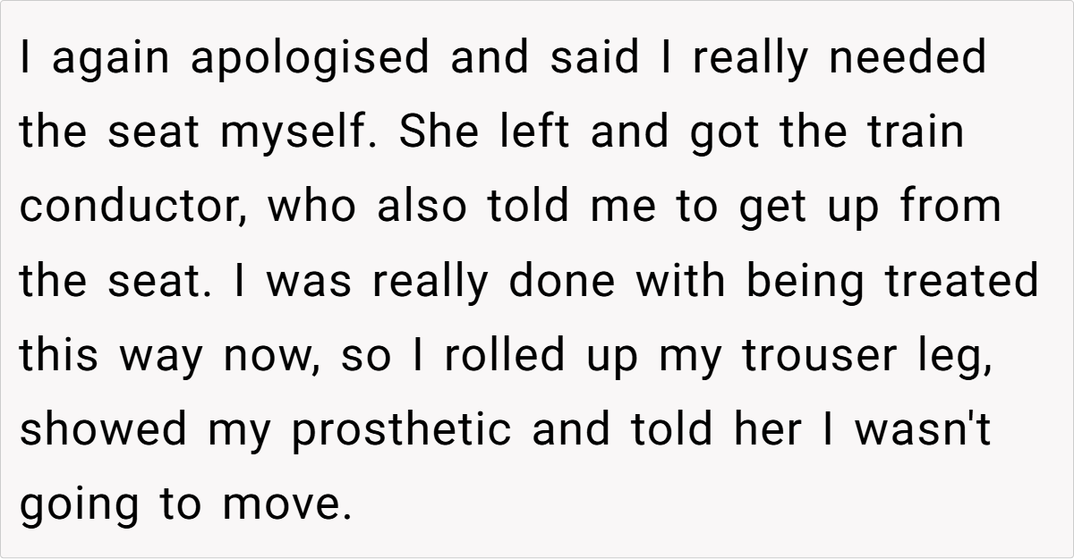 That’s exactly the frustration Original Poster (OP) faced when she took a priority seat on a crowded train. Having lost her leg in an accident years ago, OP relies on a high-tech prosthetic that allows her to move freely, but also makes her disability invisible. When a woman demanded she give up her seat, OP politely refused, but the woman didn’t back down. Instead, she escalated the situation by calling the train conductor, forcing OP into an uncomfortable choice: defend herself or prove her disability.