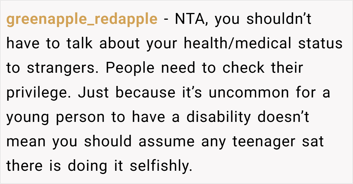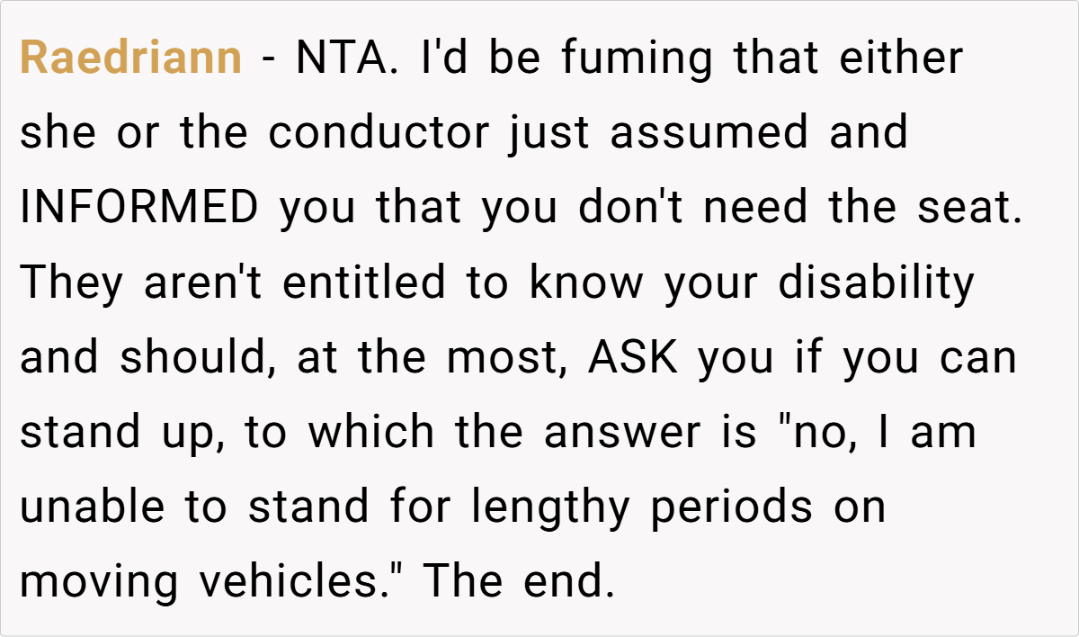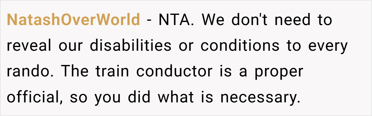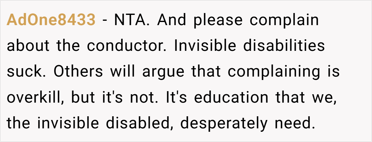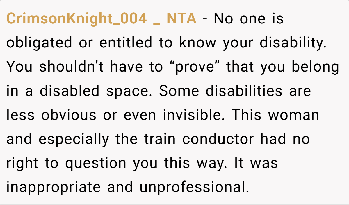 Many Reddit users agree that OP was absolutely not in the wrong in this situation.They emphasize that no one should be forced to disclose their disability just to be treated with respect. Several commenters criticized both the woman and the train conductor, pointing out that this reflects a broader issue of societal ignorance toward invisible disabilities.