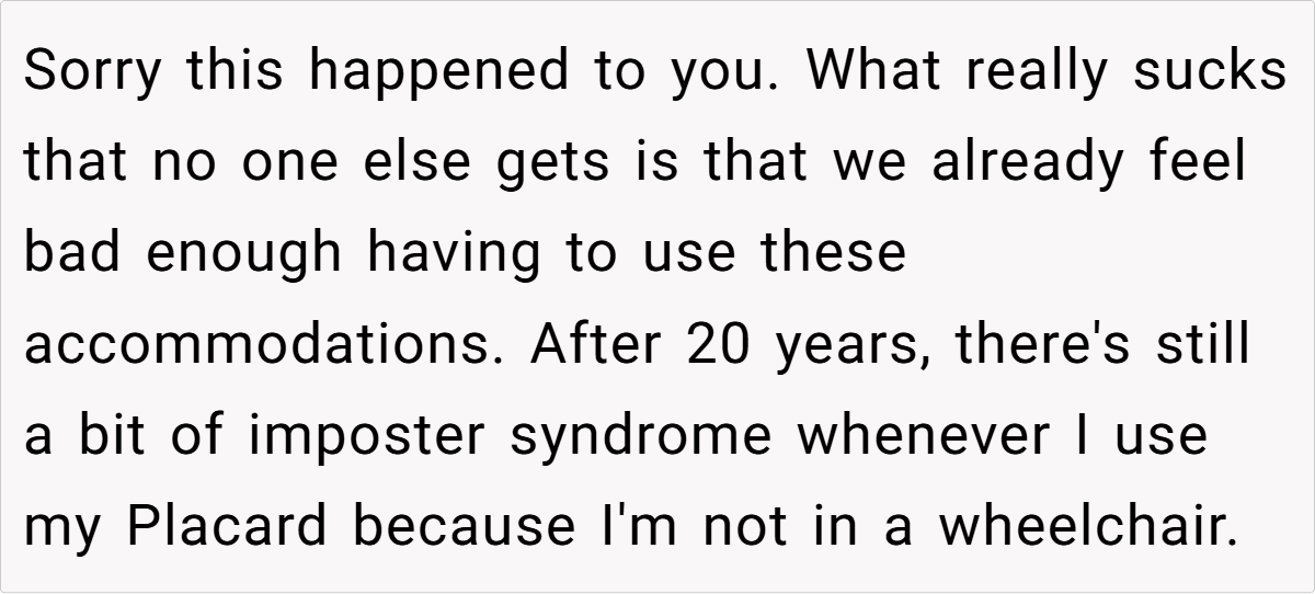 The situation OP faced is not uncommon—people with invisible disabilities frequently experience accusations of faking or abusing accommodations. According to a study by the Journal of Disability Studies, individuals with non-visible disabilities report: