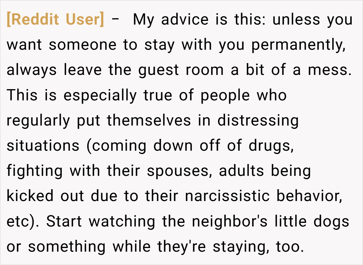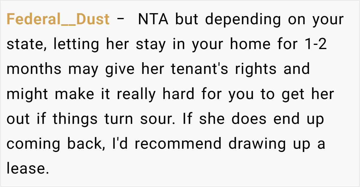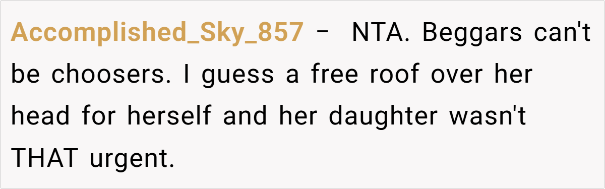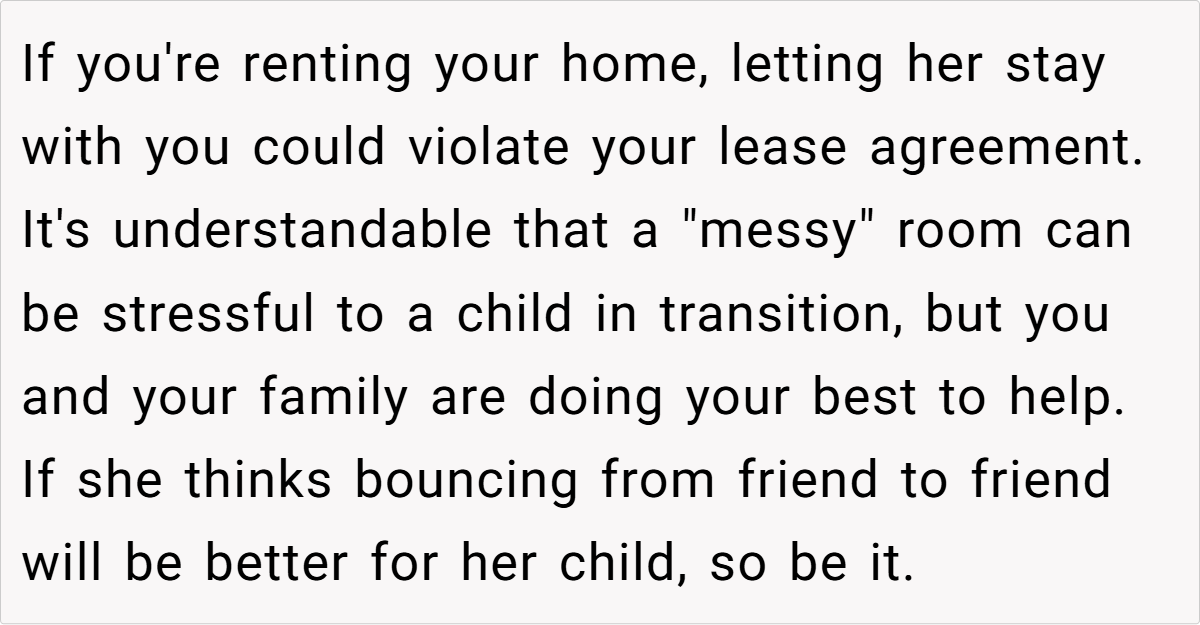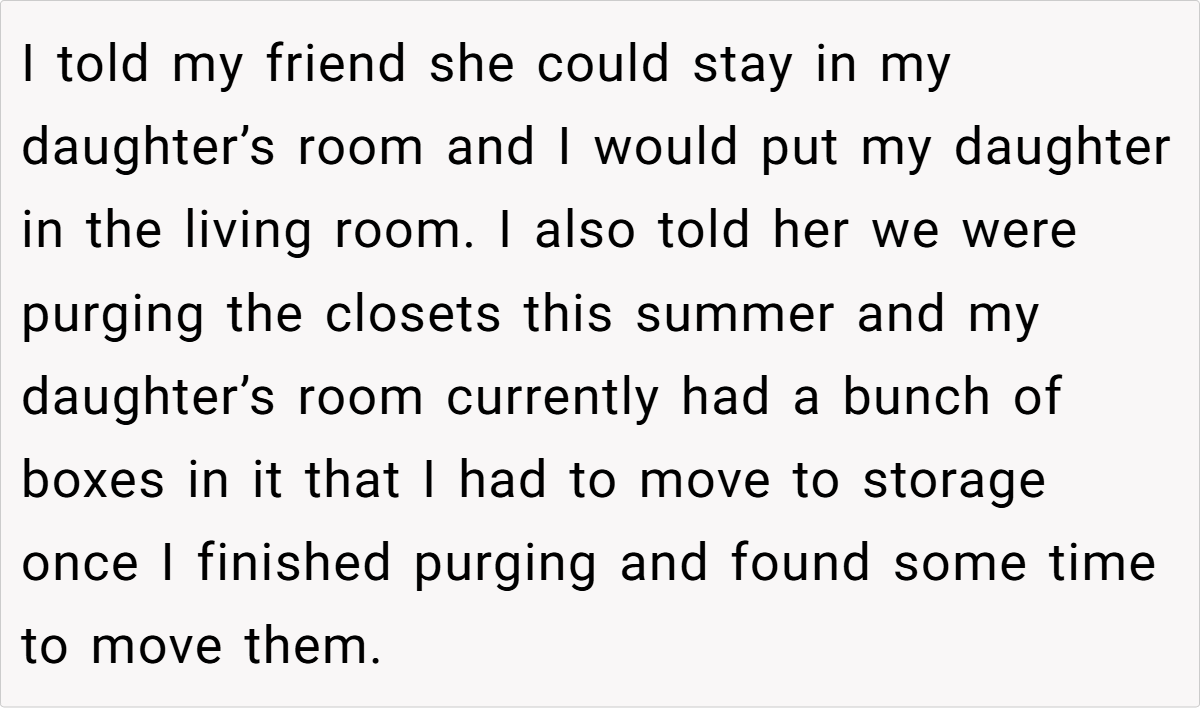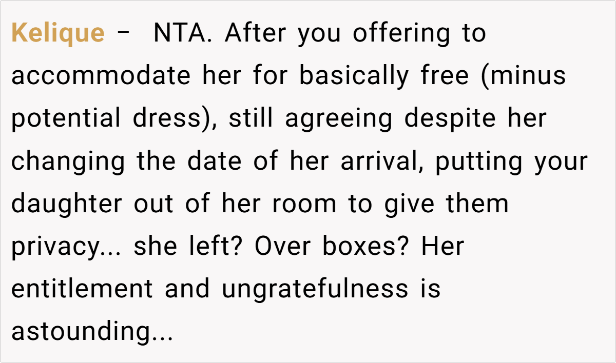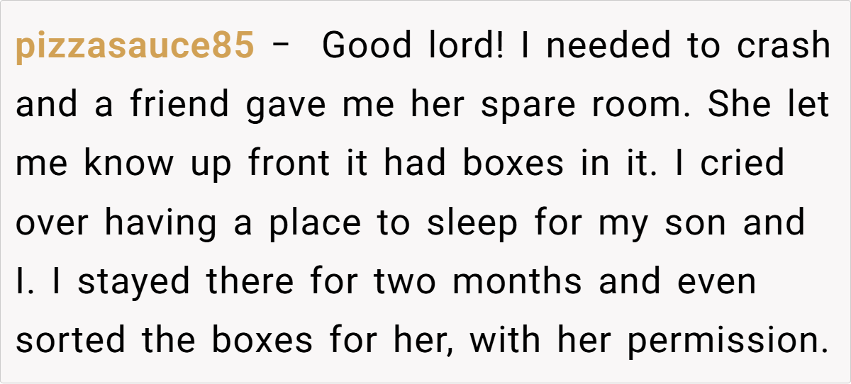 The prevailing sentiment among commenters is that the host is not in the wrong. Many point out that after offering free accommodation in her already busy household, expecting a perfectly prepped guest room is unreasonable. Commenters applaud her for her flexibility and generosity, noting that a few boxes and an unmade bed hardly diminish the value of a safe, temporary home. Some even warn that the guest’s reaction, driven by stress and high expectations, might indicate that she’s not appreciative of the help she’s been offered.