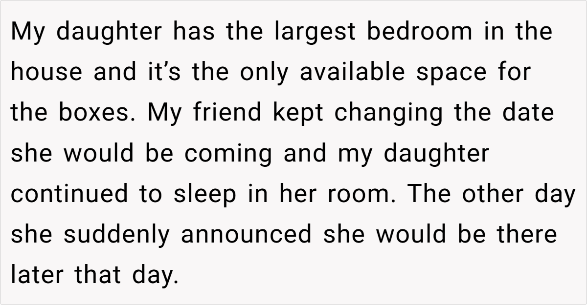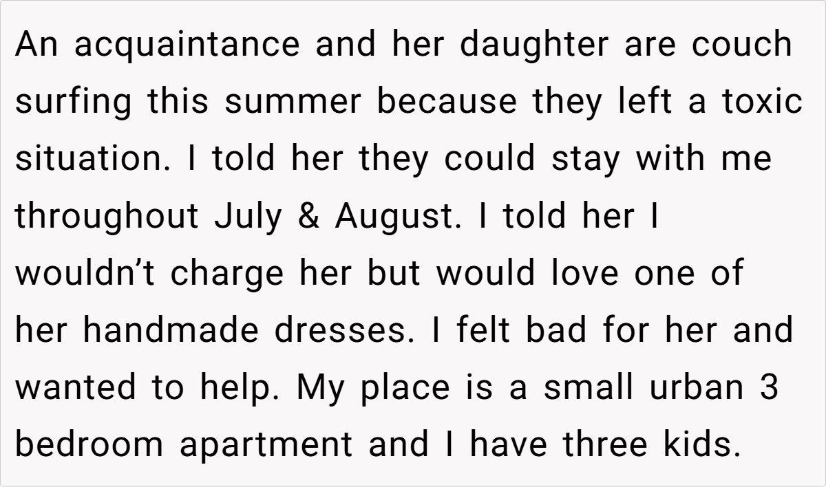 Sometimes lending a helping hand can lead to unexpected conflicts, especially when the guest’s expectations don’t match reality. In this story, a generous host offered her small urban apartment—a three-bedroom home shared with her three kids—as a temporary refuge for an acquaintance and her daughter escaping a toxic situation. Wanting to help without charging rent (aside from a simple request for one of the acquaintance’s handmade dresses), she arranged for them to stay in her daughter’s room, promising that arrangements would be made once the boxes were moved to storage.