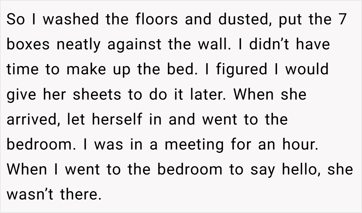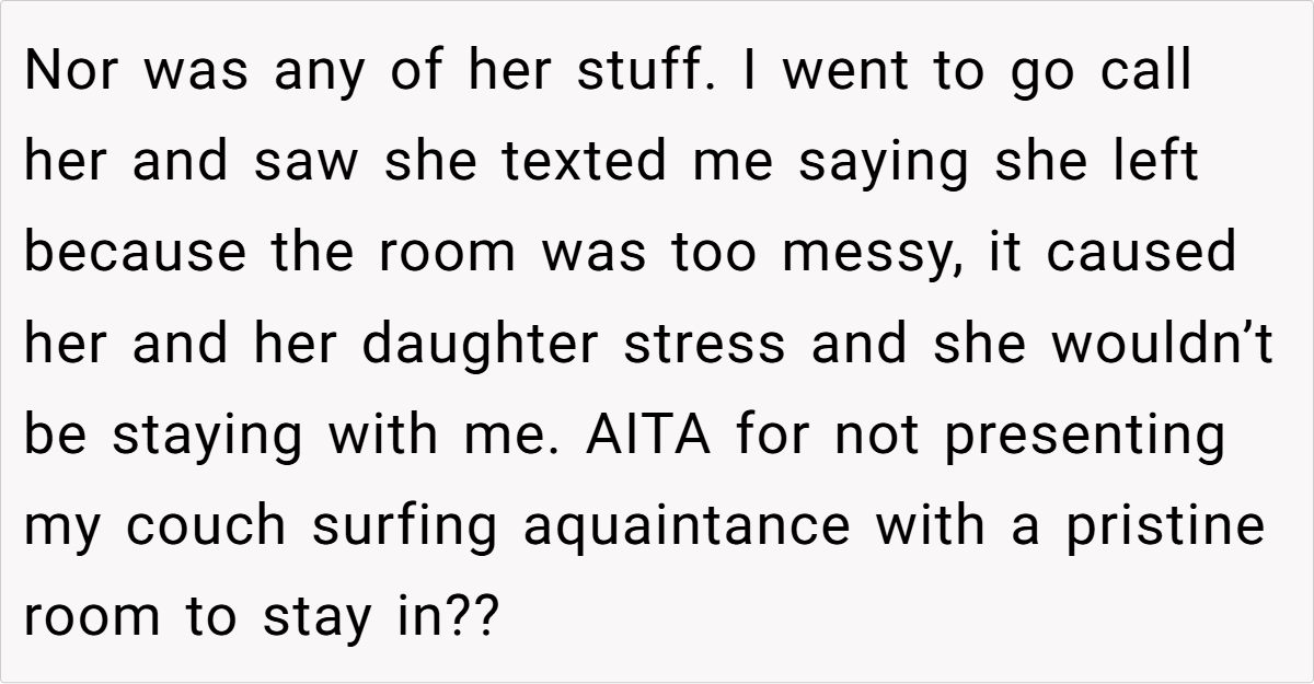 However, as the situation unfolded, miscommunications and last-minute changes created tension. When the guest finally arrived and discovered that the room wasn’t pristine as expected, she was overcome with stress and quickly left, leaving the host questioning if she was at fault. Was it reasonable to expect a perfectly prepared space, or should a little mess be forgiven under the circumstances?