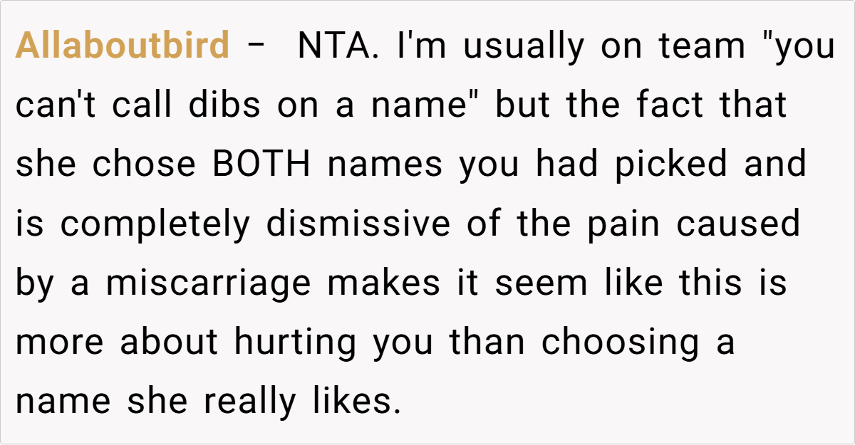 Family dynamics become especially complicated when past traumas and sensitive issues converge. In this situation, the pain from multiple miscarriages and failed IVF treatments has left deep emotional scars, making the issue of baby names even more poignant.