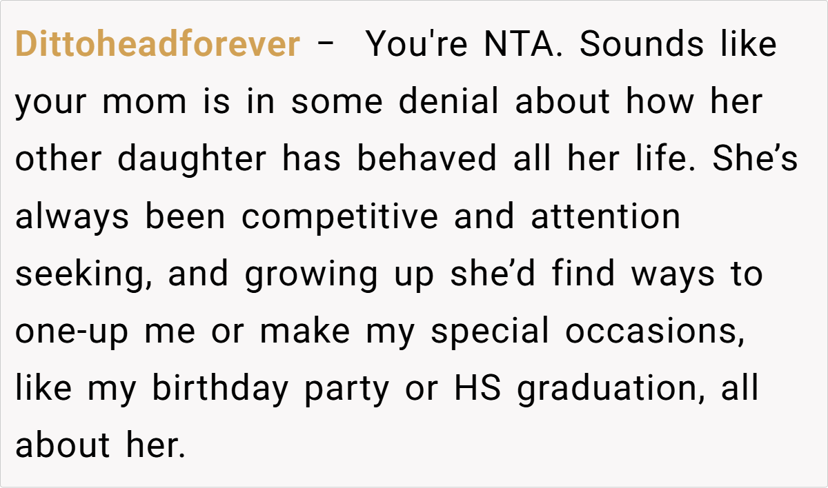 Redditors have shared varied viewpoints on this matter. Many sympathize with my decision, agreeing that my sister’s insensitive behavior—especially in light of our tragic experiences—warrants clear boundaries. Some commenters feel that her repeated, callous remarks leave me no choice but to protect my emotional space.
